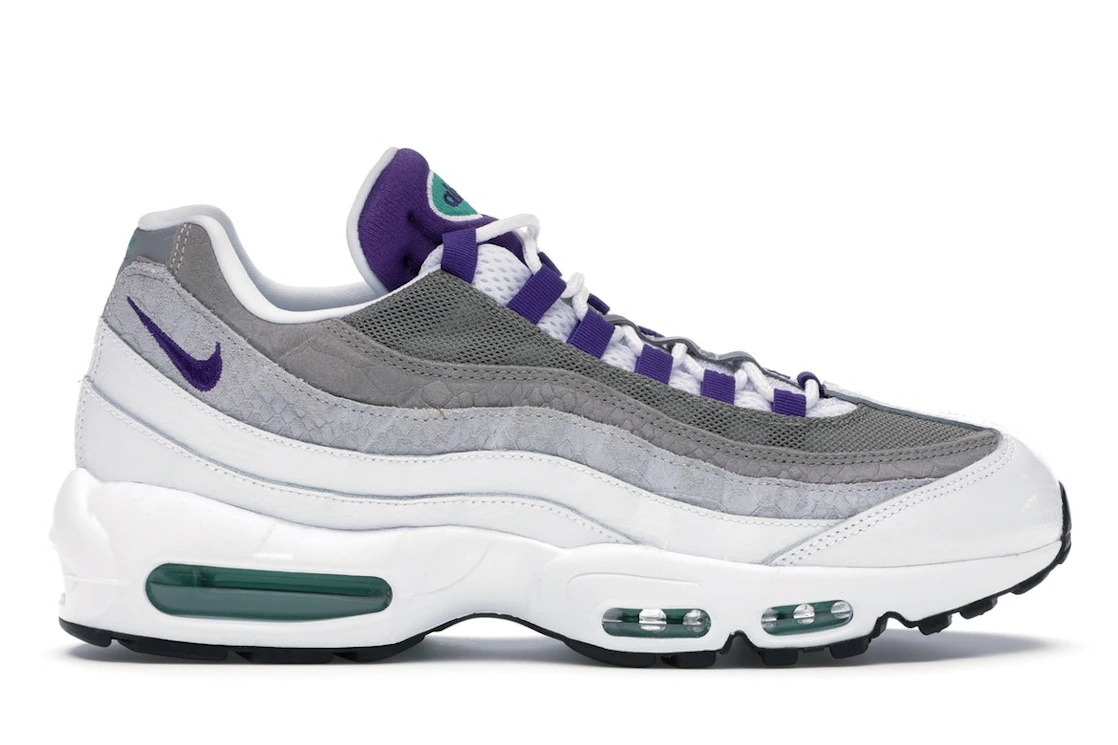The Nike Air Max 95 Grape is an original AM95 colorway that has been re-released on numerous occasions over the last three decades. The Nike Air Max 95 Grape Snakeskin was a premium version of this sneaker that included more luxurious materials than the OG Grape. At first glance, the AM95 Grape Snakeskin didn’t look dramatically different than the AM95 Grape. But after taking a closer look, it was clear this sneaker featured scaly fabrics on its upper to make it appear as though it was partially covered with snakeskin. These fabrics were also textured to make them feel like snakeskin, too, which gave this version of the AM95 an even higher-end appearance. What our experts loved most about this AM95, though, was that it didn’t stray too far from the original format for the AM95 silhouette. It still featured strong pops of purple that made it stand out. They just so happened to be strategically positioned next to snakeskin to help usher this particular AM95 into a new era. The Nike Air Max 95 Grape Snakeskin was released on August 1, 2019, and retailed for $200. - Style AO2450-101 - Colorway White/Court Purple-Emerald Green-Wolf Grey-Light Charcoal-Black - Retail Price 200 - Release Date 2019-08-01 - Featured false - Product Line Nike Air Max
