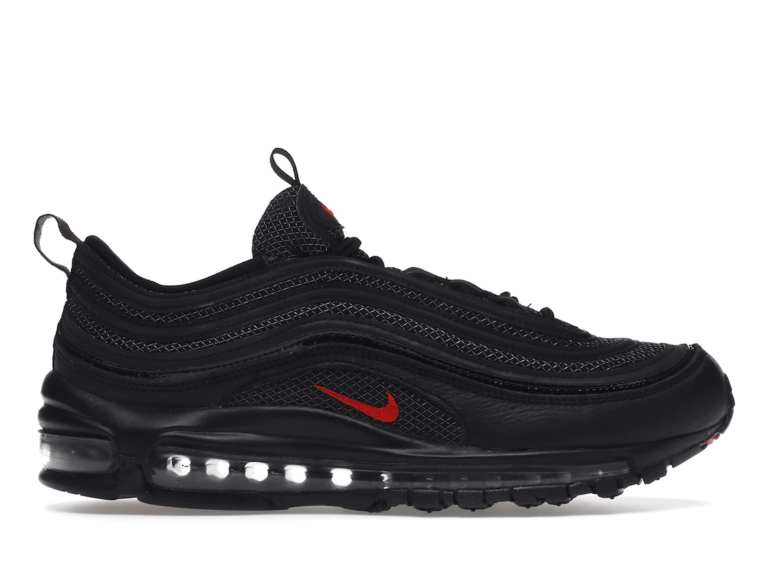 The Nike Air Max 97 Bred sneaker is part of the iconic Air Jordan collection released to celebrate Nike’s 25th anniversary. The Bred Nike Air Max 97 features the classic "Bred" colorway, which is short for black and red. It has an all-black upper and pops of red accenting the Swooshes and underneath the toe. The main mudguards are made from tumbled leather, and the remainder of the top section has grill-like mesh underlays and black reflective strips. The sneaker also has air cushioning technology. The Nike Air Max 97 Bred sneaker pair was released on August 11, 2022, and its retail price was $185. - Style DV3486-001 - Colorway Black/University Red-White - Retail Price 185 - Release Date 2022-08-11 - Featured false