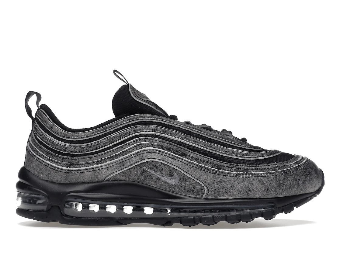 The Nike Air Max 97 Comme Des Garcons Homme Plus Black celebrates the Air Max 25th anniversary with a collaboration between CDG, the Tokyo fashion label based in Paris, and Nike. The classic undulating upper of the Nike Air Max 97 in the Black/Metallic Black colorway of this collab with Comme Des Garcons is made of opaque black mesh overlaid with faded-looking metallic black tumbled leather. Opaque black appears again on the insoles with dual branding, sock liner, and mesh tongue with Nike branding. The pull tab on the heel sports Air Max branding and a Nike swoosh appears midfoot above the mud guard on both the medial and lateral sides. What we love most about this sneaker is the dependability of the sole unit. The glistening black midsole houses a full-length Nike Air Max unit atop a black rubber outsole with a Nike swoosh highlighted on the heel. The Nike Air Max 97 Comme Des Garcons Homme Plus Black was released on September 22, 2022 for $350 retail. - Style DX6932-002 - Colorway Black/Metallic Black - Retail Price 350 - Release Date 2022-09-22 - Featured false