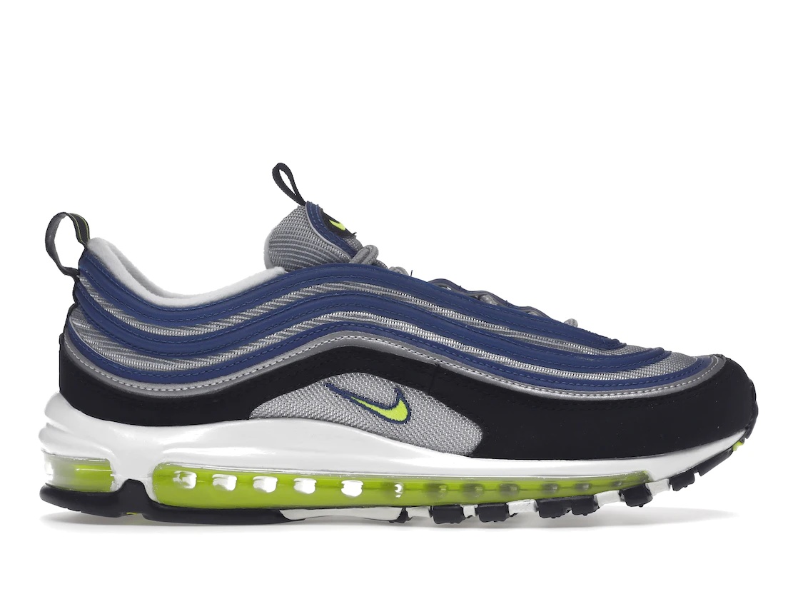 The Nike Air Max 97 OG Atlantic Blue Voltage Yellow comes in two major color blends: Atlantic Blue and Voltage Yellow. This Air Max 97 OG by Nike uses nubuck on the mudguards in addition to the conventional mesh and a leather upper of the shoe. The sneaker also features luminous stripes that become wave-like over a black mudguard. The sole is translucent. There are three small Swooshes, one on each side and another on the tongue. The Nike Air Max 97 OG Atlantic Blue Voltage Yellow was released on the 23rd of August, 2022. At the time , this product had a suggested retail price of $185. - Style DM0028-400 - Colorway Atlantic Blue/Metallic Silver/Black/Voltage Yellow - Retail Price 185 - Release Date 2022-08-23 - Featured false