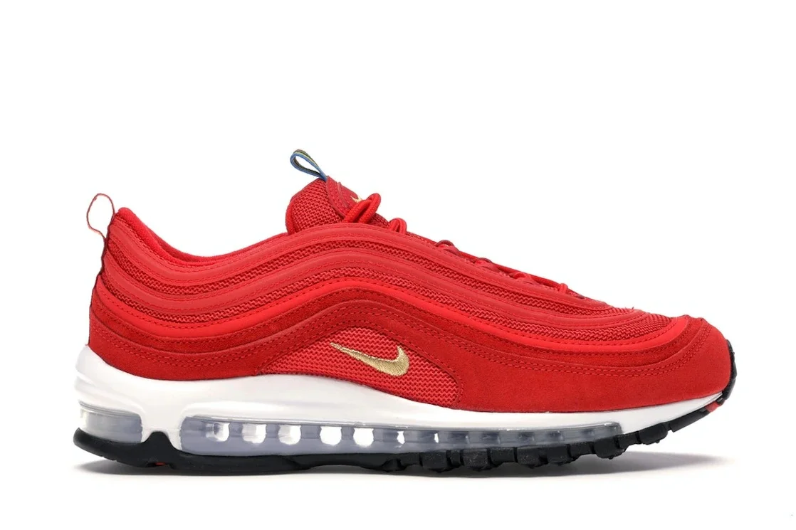 The Nike Air Max 97 Olympic Rings Pack Red was released as part of Nike's celebration of the 2020 Tokyo Olympics. The Nike Air Max 97 Olympic Rings Pack Red features a predominantly red colorway on its upper, a white rubber midsole, and a black treaded outsole for durability and traction. The sneaker's design also features the Nike Air Max 97 silhouette, including a full-length Max Air unit for cushioning. The sneaker's upper is made of synthetic leather and mesh materials, with reflective detailing for visibility, especially in low-light conditions. The design is concluded by the metallic gold that appears on the sneaker's Swoosh. The Nike Air Max 97 Olympic Rings Pack Red was released on January 7th, 2020, it retailed at $170. - Style CI3708-600 - Colorway Challenge Red/White-Black-Metallic Gold - Retail Price 170 - Release Date 2020-01-07 - Included Accessories Gold Nike Pin - Featured false - Product Line Nike Air Max