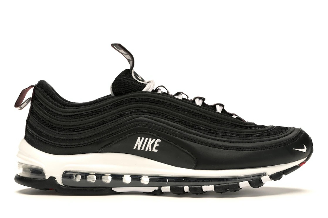 The Nike Air Max 97 Overbranding Black features a black and white colorway and is inspired by the original Air Max 97. The upper of the Air Max 97 Overbranding Black is made of a combination of leather and synthetic materials, which provide both durability and comfort. The shoe also features a full-length Max Air unit that provides excellent shock absorption and cushioning, making it a comfortable shoe for everyday wear. The Nike branding features on both sides, while the AirMax branding features across the tongue tag and heel tag. The Nike Swoosh is visible near the toe and on the tongue. We believe that the notable feature of the Nike Air Max 97 Overbranding Black is its overlay pattern. The overlays are strategically placed along the upper of the shoe, providing added structure and support where needed. This allows for a better fit and overall comfort for the wearer of the shoe. The sneaker was released on November 21st, 2018, at a retail price of $170. - Style 312834-008 - Colorway Black/White-Varsity Red - Retail Price 170 - Release Date 2018-11-21 - Featured false - Product Line Nike Air Max
