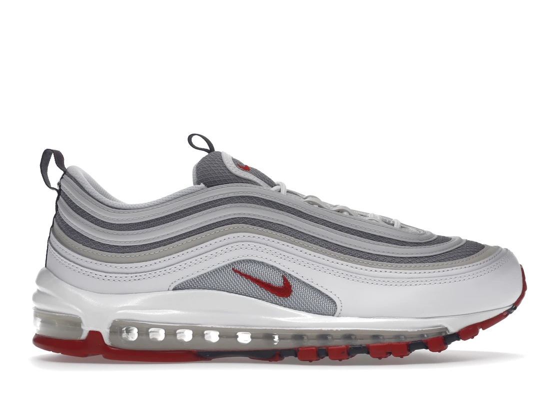 The Nike Air Max 97 White Bullet is part of the Air Max line and comes in a White colorway with Silver and Varsity Red accents. The White Bullet Air Max 97 has a breathable mesh upper that keeps your feet cool and comfortable. The shoe has a low-cut design and the sole includes a tread pattern that helps improve traction. The Nike Swoosh appears on both sides and on the tongue. The collar is padded, which adds support for the ankle. We love Nike Air Max 97 White Bullet for its innovative Air Max cushioning technology. The sneaker has a full-length Air Max unit in the sole, which provides unbeatable comfort and support for all-day wear. The Air Max unit also absorbs shock during impact and then rebounds, providing a responsive feel with every step. The sneaker was first released on June 23rd, 2022 at a retail price set at $170. - Style DM0027-100 - Colorway White/Silver-Varsity Red - Retail Price 170 - Release Date 2022-06-23 - Featured false