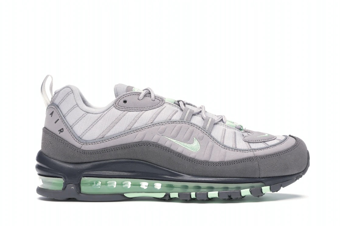 The Nike Air Max 98 Vast Grey Fresh Mint is a general release and part of the Air Max 98 line. The Nike Vast Grey Fresh Mint has an upper that features a mix of materials, including leather and textile, and is designed in a mix of gray and mint-green hues. The sneaker boasts an Air Max design with an Air Max unit in the sole for cushioning and an outsole that is made of rubber to provide traction on different surfaces. The shoe also has a lace-up closure system that offers a secure and customizable fit. The Nike Air Max 98 Vast Grey Fresh Mint was released on May 19th, 2019, at a retail price of $160. - Style 640744-011 - Colorway Vast Grey/Fresh Mint-Atmosphere Grey - Retail Price 160 - Release Date 2019-05-19 - Featured false - Product Line Nike Air Max
