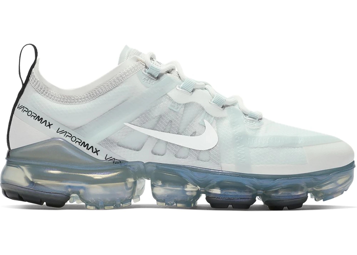 The Nike Air VaporMax 2019 Ghost Aqua (Women's) is a Ghost Aqua, Summit White, and Black iteration of the classic 2017 Nike Air VaporMax. This women's pair features a stretch-woven upper detailed with reinforced translucent taping from the midfoot to the heel that enables the shoe to remain sturdy, crisp white Nike Swoosh branding, black Vapormax branding wrapped around the heel, a tonal lacing unit, a black heel pull tab, and a silver tongue patch. Underfoot, the Nike Air VaporMax 2019 Ghost Aqua for women boasts a VaporMax Air outsole, carved out in some sections to keep the shoe flexible and lightweight and highlighted with rubber pods in high-wear areas to enhance durability. Besides its minimalistic design, what we like about the Nike Air VaporMax 2019 Ghost Aqua (Women's) is its VaporMax Air outsole, given that it provides maximum impact protection from heel to toe and adds a bounce effect. This shoe was released on January 1st, 2019. At the time, it retailed at $190. - Style AR6632-403 - Colorway Ghost Aqua/Summit White-Black - Retail Price 190 - Release Date 2019-01-01 - Featured false