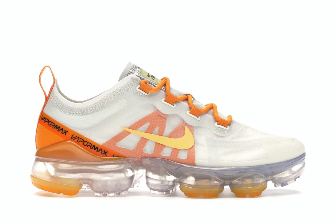 The Nike Air VaporMax 2019 White Orange Peel (Women’s) features the Nike branding, including the iconic Swoosh logo, incorporated into the design, appearing on the sneaker's sides, tongue, and heel. The outsole showcases the segmented Air Max units that provide flexibility and targeted cushioning. The midsole of the Nike Air VaporMax 2019 White Orange Peel for women features segmented pods, which contribute to the shoe’s flexibility and adaptability to the natural movement of the foot. The sneaker features a low-top profile, allowing for a full range of motion. The lace-up closure system ensures a secure and customizable fit. The standout feature of the Nike Air VaporMax 2019 White Orange Peel (Women’s) is the full-length Air Max unit that serves as both cushioning and outsole. This technology provides responsive and lightweight cushioning with every step, contributing to a comfortable and supportive wearing experience. The shoe launched on the 1st of June 2019, retailing for $190. - Style AR6632-102 - Colorway Summit White/Topaz Gold-Orange Peel - Retail Price 190 - Release Date 2019-06-01 - Featured false