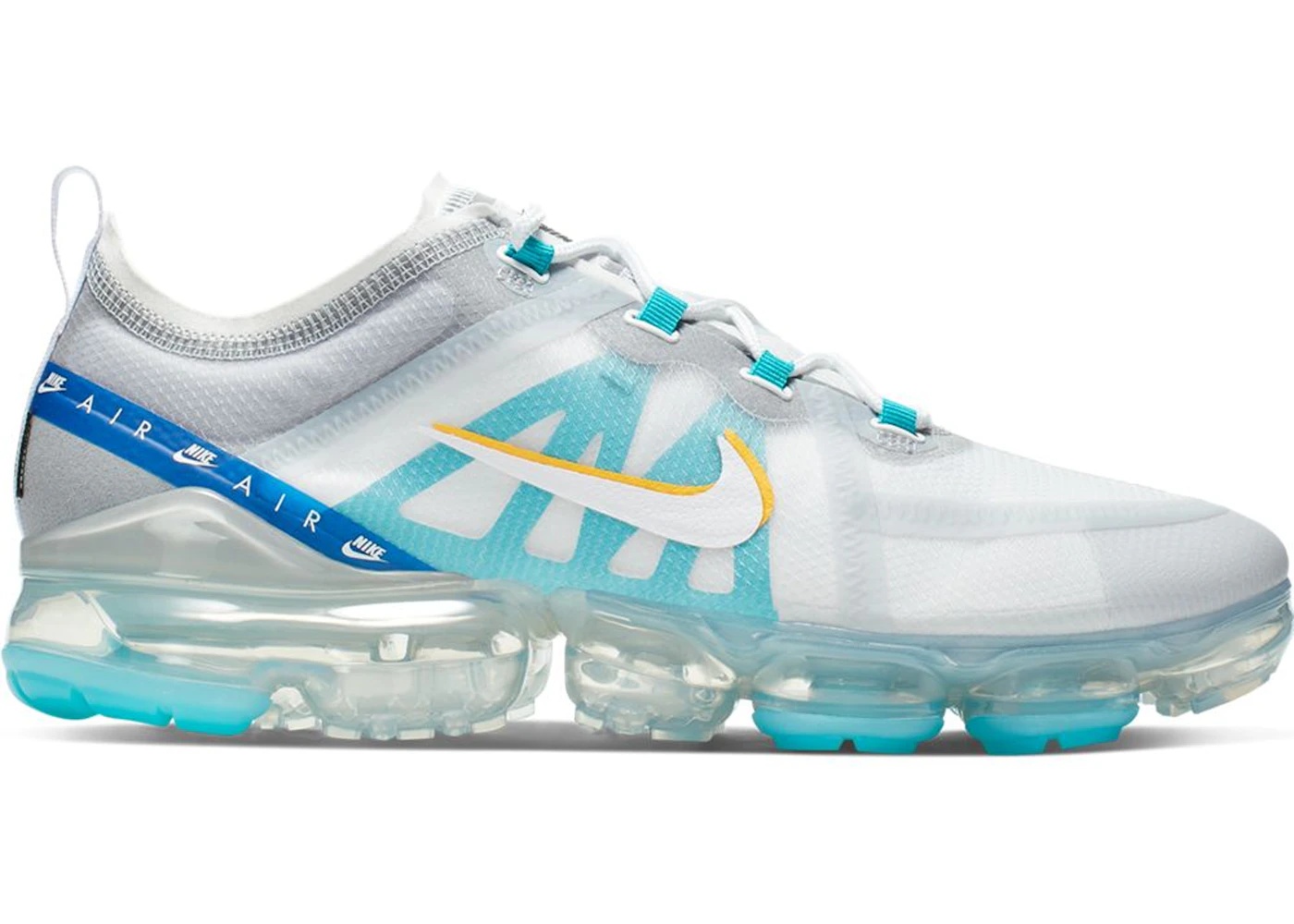 This version of the Nike Air VaporMax 2019 White University Gold Wolf Grey has a characteristic transparent TPU upper in off-white with wolf grey accents on the toe cap, eyestays, and heels. The metallic color returns on the Air VaporMax bubble sole unit, which features tiny shimmer flecks for extra shine. The Swoosh on the side panel comes in white with a gold outline, while featuring shades of pale blue, and its outsole is also covered in the same color scheme. Finally, Nike and Air wordmarks are printed in the blue tone which covers the heel and extends over to the outside quarter panel. The Nike Air VaporMax 2019 White University Gold Wolf Grey was released on 13th June 2019 and retailed at $200. - Style CI1240-102 - Colorway White/White-University Gold-Wolf Grey - Retail Price 200 - Release Date 2019-06-13 - Featured false - Product Line Nike Air Max