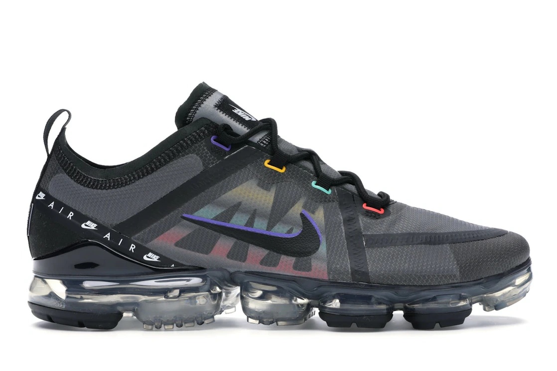 The Nike Air VaporMax 2019 Windbreaker appears in a mixture of different hues, with black, Psychic Purple, Flash Crimson, University Gold, and Kinetic Green colors. The 2019 Windbreaker Nike Air VaporMax has a special Air cushioning system called the VaporMax. This VaporMax model features individual Air units built directly into the outsole to take the place of the conventional foam midsole. The design also features a sturdy rubber outsole for traction and gripping. Completing the design is the black lacing system visible on the synthetic upper. During its launch on July 1, 2019, the Nike Air VaporMax 2019 Windbreaker had a retail price of $200. - Style CI1240-023 - Colorway Black/Black-Psychic Purple-Flash Crimson-University Gold-Kinetic Green - Retail Price 200 - Release Date 2019-07-01 - Included Accessories Nike Hang Tag - Featured false - Product Line Nike Air Max