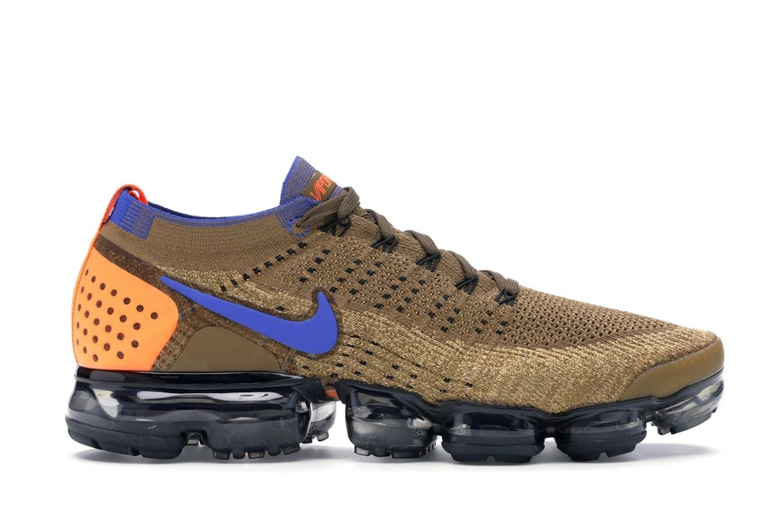 The Nike Air VaporMax Flyknit 2 Golden Beige Racer Blue comes in six different hues: dark gray, Total Orange, Desert Moss, Club Gold, Racer Blue, and Golden Beige. This Golden Beige Racer Blue Nike Air VaporMax Flyknit 2 showcases a Flyknit. This shoe is also enhanced by a sock-like collar and a lightweight taped Swoosh on the side panel. Additional features of this shoe include a taped heel wrap, a fully visible Air-Sole unit, rubber outsole, and heel pulls. The Nike Air VaporMax Flyknit 2 Golden Beige Racer Blue was set to sell at $190 when it debuted on October 4, 2018. - Style 942842-203 - Colorway Golden Beige/Racer Blue-Club Gold-Desert Moss-Total Orange-Dark Grey - Retail Price 190 - Release Date 2018-10-04 - Featured false - Product Line Nike Air Max