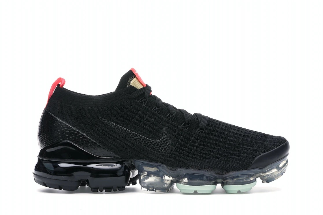 The Nike Air VaporMax Flyknit 3 Black Snakeskin sneaker is made of a black color scheme, and its upper features a sock-like fit. This Air VaporMax model has its medial and lateral side panels printed with a Swoosh emblem. The tongue is covered in a glittering gold material across its surface, with a hint of crimson added on top. It also features a crimson colorway on its heel to create a heel tab, while its tongue displays the Nike Swoosh and tag. Finally, there is a Vapormax tag on the ankle medial. The Nike Air VaporMax Flyknit 3 Black Snakeskin was released on October 28th, 2019 and retailed at $190. - Style AJ6900-023 - Colorway Black/Gold-Crimson-Black - Retail Price 190 - Release Date 2019-10-28 - Featured false - Product Line Nike Air Max