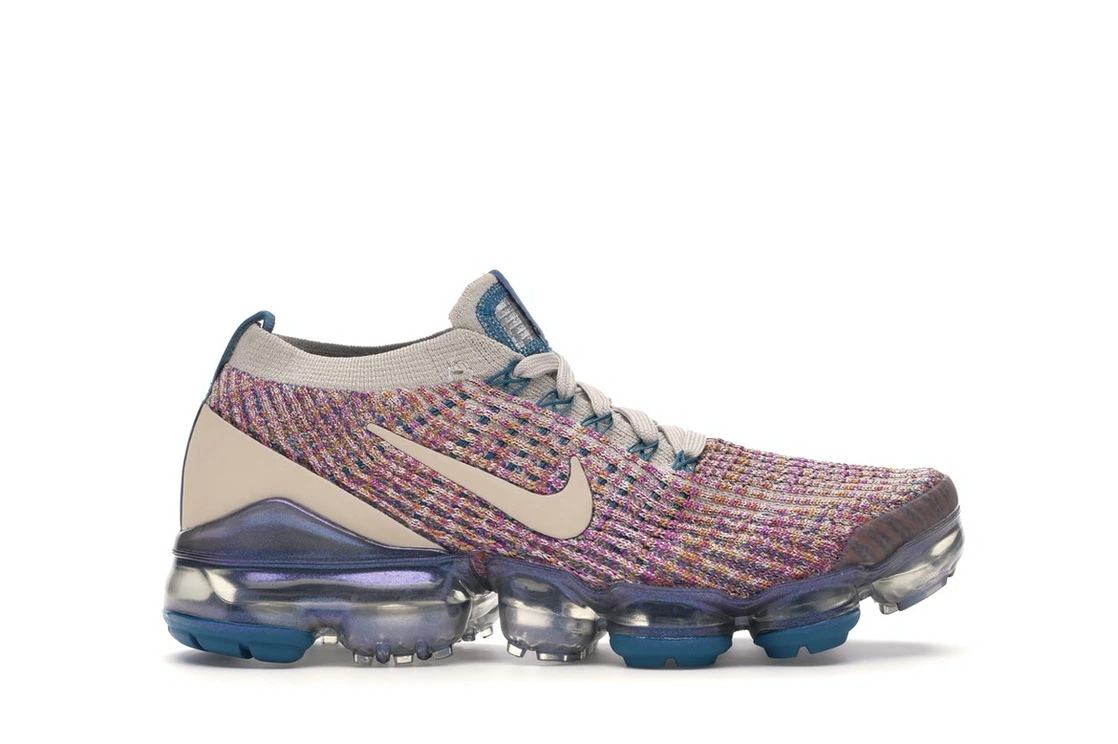 The Nike Air VaporMax FlyKnit 3 Desert Sand Vivid Purple (Women's), a shoe specifically designed for women, presents a high-fashion sneaker with buoyant bounce to give comfort in every step. The Women’s Nike Air VaporMax FlyKnit 3 comes in a Desert Sand/Vivid Purple/Green Abyss colorway, featuring a FlyKnit upper of a primarily neutral hue in a sandy color, with hints of purple and green. Flywire cables extend from the laces to give the shoe support. A Desert Sand Swoosh and heel overlay in soft molded plastic complement the colors in the upper, the laces, the tongue, and the sock liner. The tongue tag and heel tab, along with the eyestays, provide hits of blue. Visible Air cushioning is encapsulated in the translucent midsole. What our shoe experts love most about this sneaker is its high-performance outsole, with integrated translucent lugs and blue rubber pods. The Nike Air VaporMax FlyKnit 3 Desert Sand Vivid Purple (Women’s) was released on January 1st, 2019, for a retail price of $190. - Style AJ6910-007 - Colorway Desert Sand/Vivid Purple-Green Abyss-Desert Sand - Retail Price 190 - Release Date 2019-01-01 - Featured false