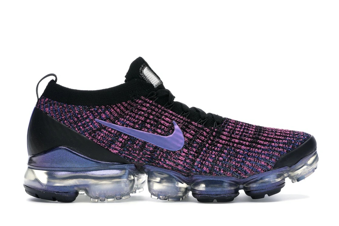 The Nike Air VaporMax Flyknit 3 Throwback Future is a special iteration of the VaporMax collection that incorporates the Throwback Future silhouette, drawing inspiration from futuristic themes and colors. The shoe features a lightweight Flyknit upper with VaporMax cushioning technology as is visible from the Air cushioning unit which has Air pods attached to the outsole. It has a color scheme with gradient shades of purple, pink and blue covering the shoe as well as blocks of black on the heel and tongue area. The Nike Air VaporMax Flyknit 3 Throwback Future was released for retail priced at $190 on March 21, 2019. - Style AJ6900-007 - Colorway Black/Blue Lagoon-Laser Fuchsia-Metallic Silver - Retail Price 190 - Release Date 2019-03-21 - Featured false - Product Line Nike Air Max