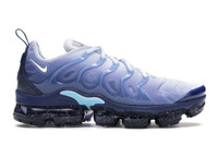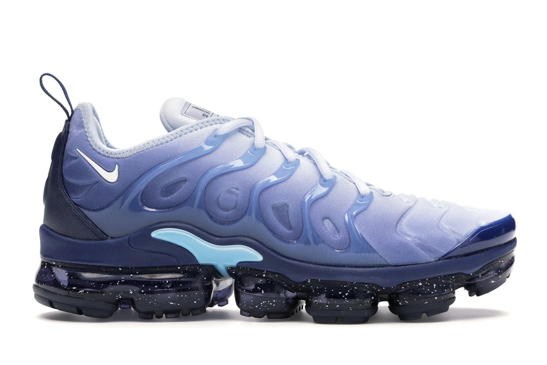 The Nike Air VaporMax Plus Blizzard is a performance sneaker equipped with Air VaporMax technology, whose colorway was inspired by blizzard events. This iteration of the Nike Air VaporMax Plus features an upper made of breathable textile. The upper appears with an ombre effect, starting with white around the laces and fading into dark blue on the lateral side and a lighter blue on the inner side. Transparent blue supports form the eyelets and snake down the side to the midsole in waves, while a dark blue panel forms the heel and has Air VaporMax branding under the pull tab. The tongue also features a logo patch. A navy-blue midsole with light blue accents at the arch and a dark blue sole with white speckles and Air VaporMax cushioning completes the look. Our favorite thing about this shoe is the speckled sole, which not only adds visual interest, but also provides functionality. The Nike Air VaporMax Plus Blizzard was released on August 1, 2019, for $190. - Style CK1411-400 - Colorway Coastal Blue/Light Blue-Blue Void-White - Retail Price 190 - Release Date 2019-08-01 - Featured false - Product Line Nike Air Max