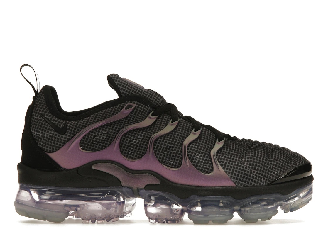 The Nike Air VaporMax Plus Eggplant is a hybrid silhouette with an updated eggplant colorway. Remaining true to style, the sneakers employ a cage-like construction and VaporMax sole unit. The Eggplant-colored sneakers come in the sole black/dark grey and aluminum black colorway. The upper decked out in black is constructed from synthetic fibers. This silhouette's upper is an innovative take on the VaporMax Plus and comes in a grid-style pattern. A wavy TPU overlay featuring a black and purple gradient with iridescent cages adorns the mesh-constructed upper. On the underfoot is a full-length VaporMax bubble sole unit sporting a translucent purple color falling in step with the ‘eggplant’ theme. What we love about the Eggplant-inspired model are the shades of aqua blue on the tongue and the opalescent green heel pull tab that flank the sneakers muted look with playful colors. The Nike Air VaporMax Plus Eggplant was released on January 1st, 2019, retailing for $190. - Style 924453-014 - Colorway Black/Dark Grey-Aluminum-Black - Retail Price 190 - Release Date 2019-01-01 - Featured false - Product Line Nike Air Max