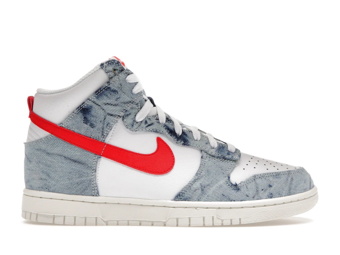 The Nike Dunk High Denim (Women's) arrives with a tumbled white leather upper with bleached denim overlays and smooth red leather Swooshes. To coincide with the design's throwback aesthetic, a slightly yellowed sole provides an aged look. The Nike Dunk High Denim (Women's) released in June of 2022 and retailed for $125. - Style DV2181-900 - Colorway White/Washed Denim-Red - Retail Price 110 - Release Date 2022-05-01 - Estimated Retail Price 100 - Featured false