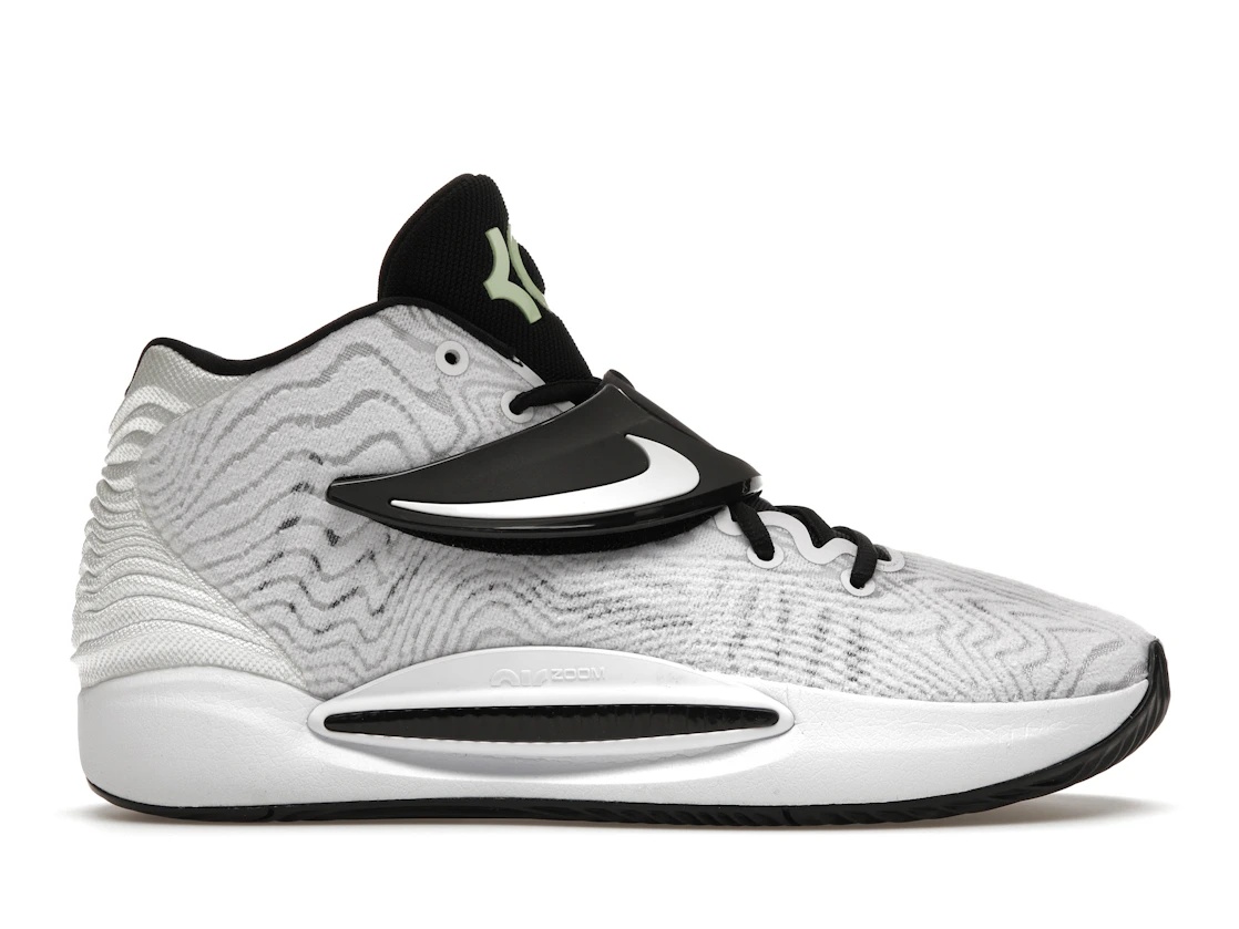 The Nike KD 14 TB White Black is part of Kevin Durant’s 14 edition with Nike. While other Nike KD 14 TB variations come in team-based colors, the "White Black" iteration offers a neutral colorway that does not align with a particular sports team. The multi-layer mesh upper features a pattern resembling a fingerprint or a tree’s rings. A sturdy, synthetic strap secures the foot while adding contrasting styling. The lateral side of the strap displays the signature Nike Swoosh, while the medial side boasts a 4-slate configuration that promotes breathability and flexibility. The sneaker houses a full-length Zoom Air unit and Cushlon foam cushioning designed to absorb impact. Our StockX experts love the subtle, black Swoosh on the medial side of the sneaker. It adds additional branding without distracting from the shoe’s minimalist design. The Nike KD 14 TB White Black was released on September 7, 2021, and retailed at $130. - Style DA7850-100 - Colorway White/Black - Retail Price 130 - Release Date 2021-09-07 - Featured false - Product Line Nike KD