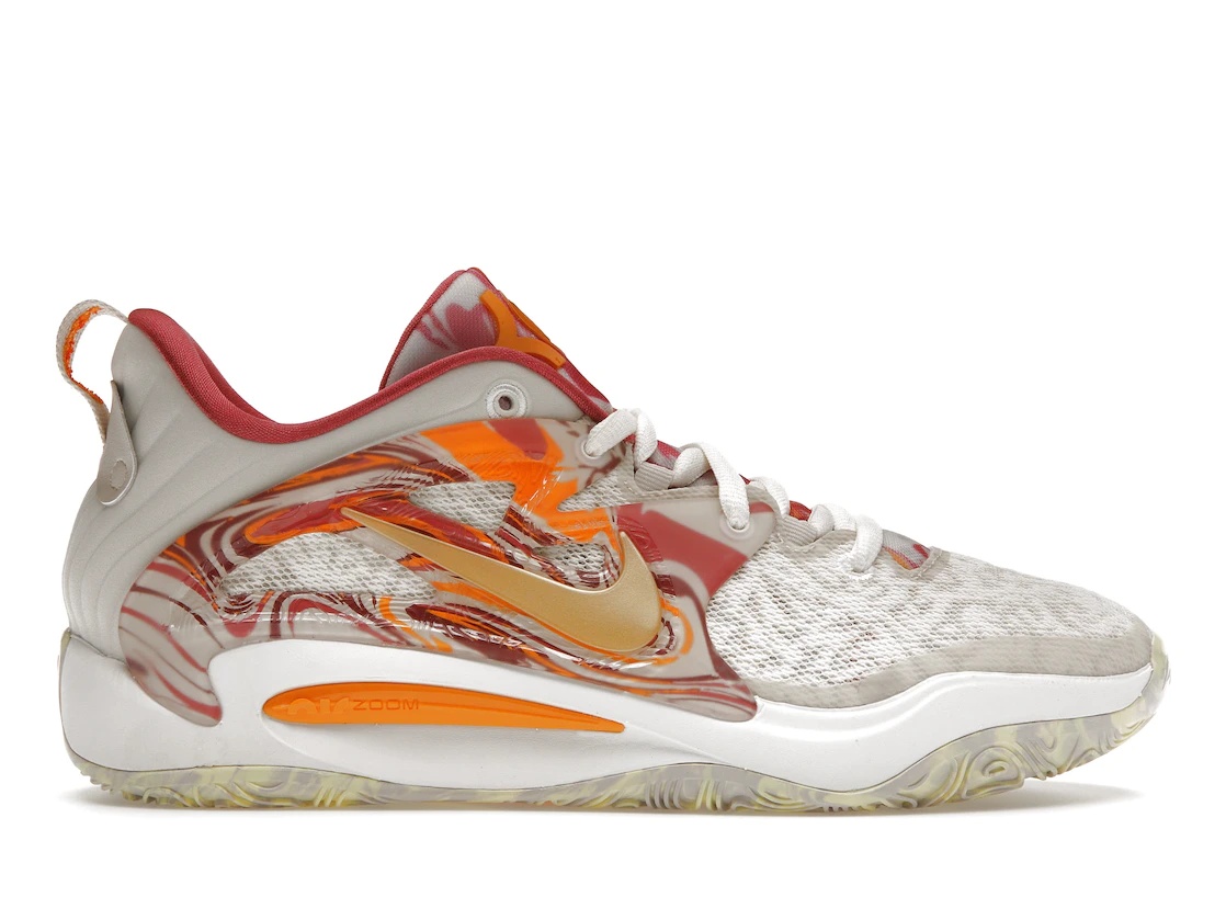 The Nike KD 15 All-Star debuts in a light brown shade with marbled side prints, featuring KD branding on both the tongues and heels, along with '07' on the lower heels. The All-Star Nike KD 15 is presented in a color scheme consisting of Light Orewood Brown, Citron Tint, Sail, Metallic Gold, and Sundial. The shoe is constructed with a standard breathable mesh upper, showcasing a marbled texture on the TPU tongue and exoskeleton overlays. The lower heels feature the familiar 07 moniker and KD branding, while the overall design is complemented by a Zoom Air cushioned sole. Completing the design is a Metallic Gold Swoosh encircled by a TPU overlay featuring orange and pink marbling, while the sneaker is supported by a vibrant multicolored rubber outsole. What our experts love about the Nike KD 15 All-Star is its unique color palette, which adds a touch of bold and contrasting elegance to the overall design. The sneaker debuted for $160 on February 16th, 2023. - Style DV1199-100/DV1200-100 - Colorway Light Orewood Brown/Metallic Gold/Sundial/Sail/Citron Tint - Retail Price 160 - Release Date 2023-02-16 - Featured false - Source merchandising-international-personal - Uploaded By MM