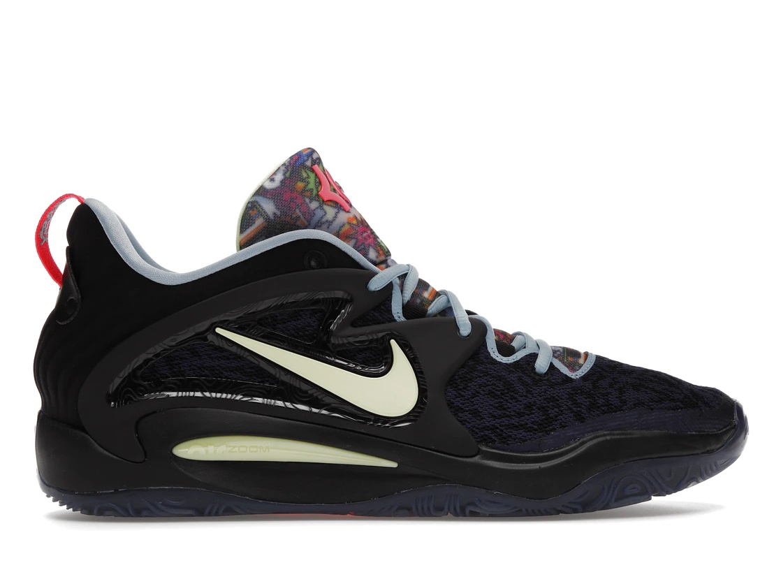 The Nike KD 15 Beginnings is a sneaker with Zoom Air technology designed by Leo Chang for the basketball catalogue. The Nike KD 15 has a color combination of black, sand drift, aura, and boarder blue. The shoe’s upper portion has a black and navy multilayered mesh with floating TPU wings that integrate into the lacing system for a locked-in fit. The sneaker has a molded yellow Nike Swoosh branding, "Easy"-inscribed heel tabs, and a vibrant pink Kevin Durant (KD) logo atop a graphic-print tongue. A full-length Zoom Strobel features on the black midsole with a multidirectional navy outsole. The Nike KD 15 Beginnings was released on April 23, 2022, at a retail price of $160. - Style DC1975-001 - Colorway Black/Boarder Blue-Sanddrift-Aura - Retail Price 160 - Release Date 2022-04-23 - Featured false