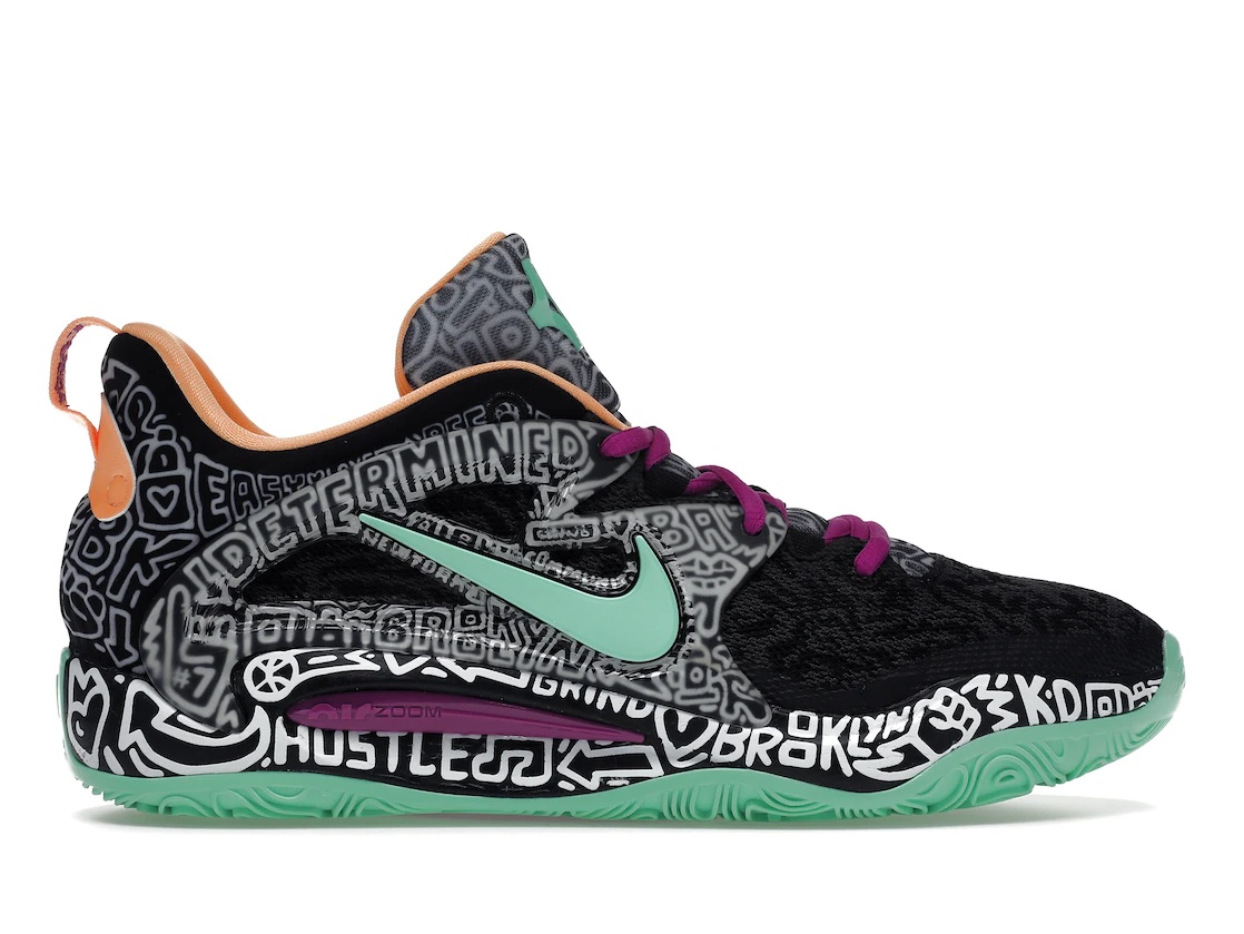 The Nike KD 15 Brooklyn Graffiti, with a black and white graphic print on, is accented with vibrant hits throughout the design. Inspired by NBA player Kevin Durant, this Nike shoe features a upper section made from black knit textile. The seafoam green Swoosh matches the branding on the tongue as well as the rubber outsole with topographical map patterning. Bright peach-yellow appears on the heel tab, "Easy"-branded pull tab, and sock liner. Violet laces, a visible Air Zoom unit in the midsole and a wave pattern sole complete the look. The Nike KD 15 Brooklyn Graffiti was released on December 9th, 2022 for a retail price of $160. - Style DC1975-005/DM1054-005 - Colorway Wolf Grey/Hyper Royal/Peach Cream/Light Crimson - Retail Price 160 - Release Date 2022-12-09 - Featured false