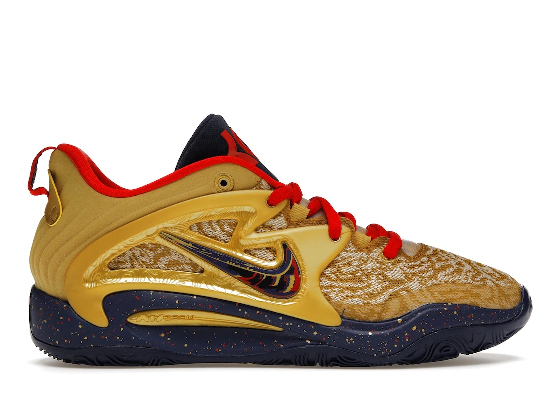The Nike KD 15 Olympics Gold Medal is a low-top silhouette in a gold and navy-red color palette. The 'Olympics Gold Medal' Nike KD 15 has an upper constructed from a combination of synthetic materials and mesh, providing lightweight support and ventilation. The shoe features a midsole made from Nike's signature Zoom Air cushioning, offering responsiveness. The outsole features a multi-directional pattern, ensuring grip and traction. In addition, the sneaker showcases various branding elements including the signature Nike Swoosh on the sides, Kevin Durant's logo on the tongue, and the signature "07" embellishment on the heel cap. Something we like about this shoe is its striking combination of gold and navy red. The upper of the shoe is dressed in gold accentuated by navy-red detailing, adding depth and contrast to the design. The Nike KD 15 Olympics Gold Medal was released on February 17, 2023, and sold for a retail price of $160. - Style DC1975-700/DM1054-700 - Colorway Gold/Navy-Red - Retail Price 160 - Release Date 2023-02-17 - Included Accessories Navy extra laces, gold extra laces - Featured false - Source merchandising-international-personal - Uploaded By MM
