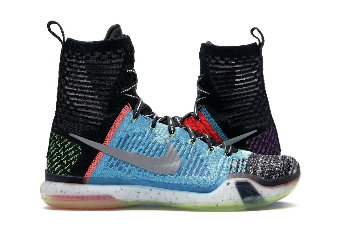 The Nike Kobe 10 Elite High ‘What the’ adopts a high-top silhouette in a multi-color and reflective silver color scheme. The "Elite High What the" Nike Kobe 10 features an upper that is constructed with Flyknit technology, which offers a lightweight feel and breathability while also ensuring a secure and comfortable fit. The shoe also utilizes Nike Air cushioning in the midsole, which provides responsiveness and cushioning. In addition, the shoe features a carbon fiber heel counter, which enhances stability and support. The sneaker features the Kobe Bryant Logo on the tongue and the Nike Swoosh on the sides. What we like about the shoe is its visually stunning multi-color combination that blends harmoniously to create an eye-catching design. The shoe's upper features a mix of bright hues, including electric green, royal blue, black, bold red, and reflective silver, meticulously arranged to form an intricate patchwork design. The Nike Kobe 10 Elite High ‘What the’ was released on December 30, 2015, and retailed for $260. - Style 815810-900 - Colorway Multi-Color/Reflective Silver - Retail Price 260 - Release Date 2015-12-30 - Featured false - Product Line Nike Kobe - Styles Headwear