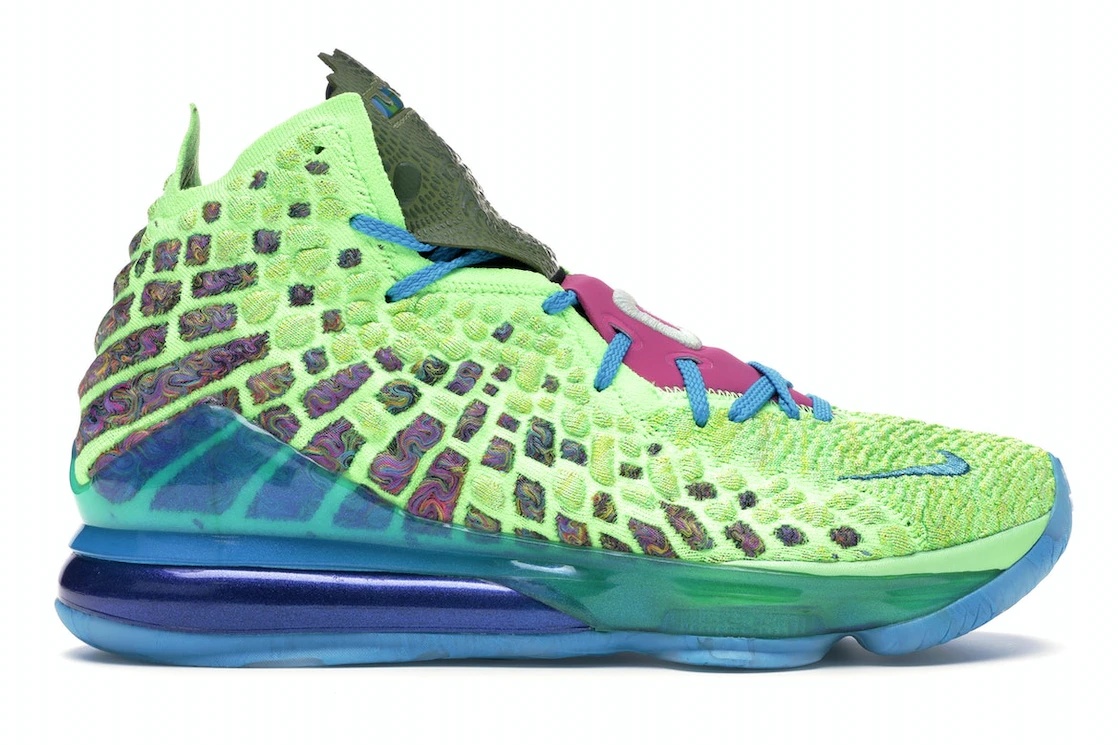 Inspired by "Mr. Swackhammer," the main villain from the Space Jam movie, the Nike LeBron 17 Mr. Swackhammer is a special All-Star Weekend 2020 offering of the Nike Lebron 17, released as part of the "Space Jam" collection. This Nike Lebron 17 features an Electric Green Knitposite upper with contrasting hues appearing on different areas, especially the heel. Laser Blue on the laces and the miniature Swoosh embroidered on the toe contrast the upper. Other details include a Reptilian tongue with Lebron’s logo, a purple lace shroud with "0" embroidered on it, and a space-themed insole with the Space Jam logo. The upper rests on a full-length Air midsole and a Laser Blue rubber outsole. What our experts love about this Lebron 17 is its design and colorway. The upper construction and color scheme add style and comfort to the sneaker. The Nike LeBron 17 Mr. Swackhammer was released on February 19th, 2020, for a price of $225. - Style CV8075-300 - Colorway Ghost Green/College Navy-Orange Trance-Laser Blue - Retail Price 225 - Release Date 2020-02-19 - Featured false - Product Line Nike LeBron