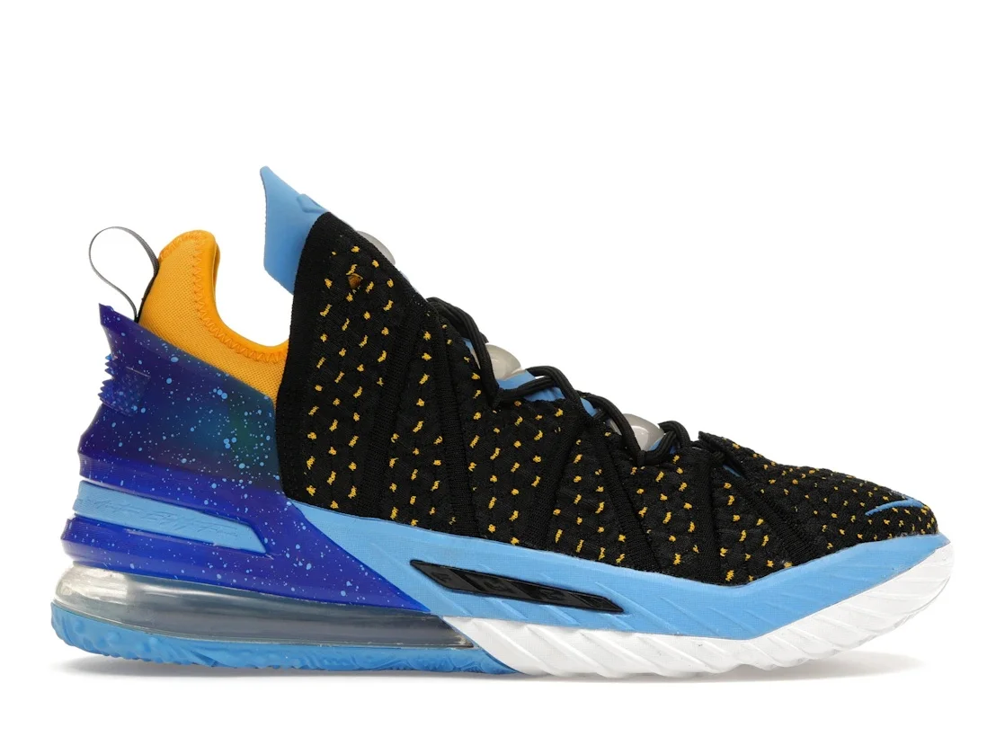 The Nike LeBron 18 Dynasty Minneapolis Lakers is a basketball shoe designed to enhance performance while minimizing stress on the body. This version of the Nike LeBron 18 is constructed with a lightweight KnitPosite 2.0 upper for flexibility and durability. The upper is mainly black, with some University Gold specks peeking through. The upper sits on top of a light blue and white Zoom Air unit designed to give the wearer extra speed. Around the heel, you’ll find panels with galaxy designs atop a translucent Air MAX unit for jump return. There’s extra cushioning around the ankle, and the Nike swoosh appears gold on the heel. What we appreciate most about this shoe is the unique combination of colors. The galaxy designs contrast perfectly with the bright University Gold, while the black of the upper adds a severe tone. The Nike LeBron 18 Dynasty Minneapolis Lakers was first released on May 1, 2021, for a retail price of $200. - Style CQ9283-006/CQ9284-006 - Colorway Black/University Gold-Coast-Concord - Retail Price 200 - Release Date 2021-05-01 - Featured false - Product Line Nike LeBron