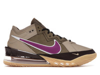 Nike paid homage to Japanese retailer atmos with the LeBron 18 Low atmos Viotech. The Viotech colorway is inspired by the celebrated 2003 atmos x Nike Air Max 1 Viotech. The LeBron 18 Low atmos Viotech features a brown leather and Durabuck upper with a large purple Swoosh outlined in white leather. As a nod to the atmos AM1, a Nike Air Max woven patch is placed on the tongue. A gum outsole adds the finishing touch to the design. The LeBron 18 Low atmos Viotech released in May of 2021 and retailed for $160. - Style CW3153-200 - Colorway Khaki/Dark Mocha/Metallic Gold-Viotech - Retail Price 160 - Release Date 2021-05-04 - Featured false