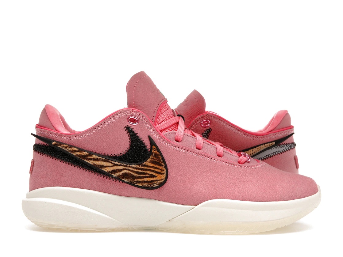 The Nike LeBron 20 Pink with the pink leather upper, features matching deco stitching and a cushioned collar lined with quick-drying Nike Sphere. An additional Swoosh in faux pony hair is layered atop a white pebbled leather Swoosh on the side. The low-top shoe is supported by a midsole that has a forefoot Zoom Air bag and a bottom-loaded Zoom Air unit in the heel. Torsion stiffness is provided by a midfoot shank made of carbon fiber. Additionally, this version includes a printed inscription of "XX." The Nike LeBron 20 Pink was released on December 3rd, 2022, and retailed at the price of $210. - Style DQ3827-900/DQ3828-900 - Colorway Multi-Color/Multi-Color - Retail Price 210 - Release Date 2022-12-03 - Featured false