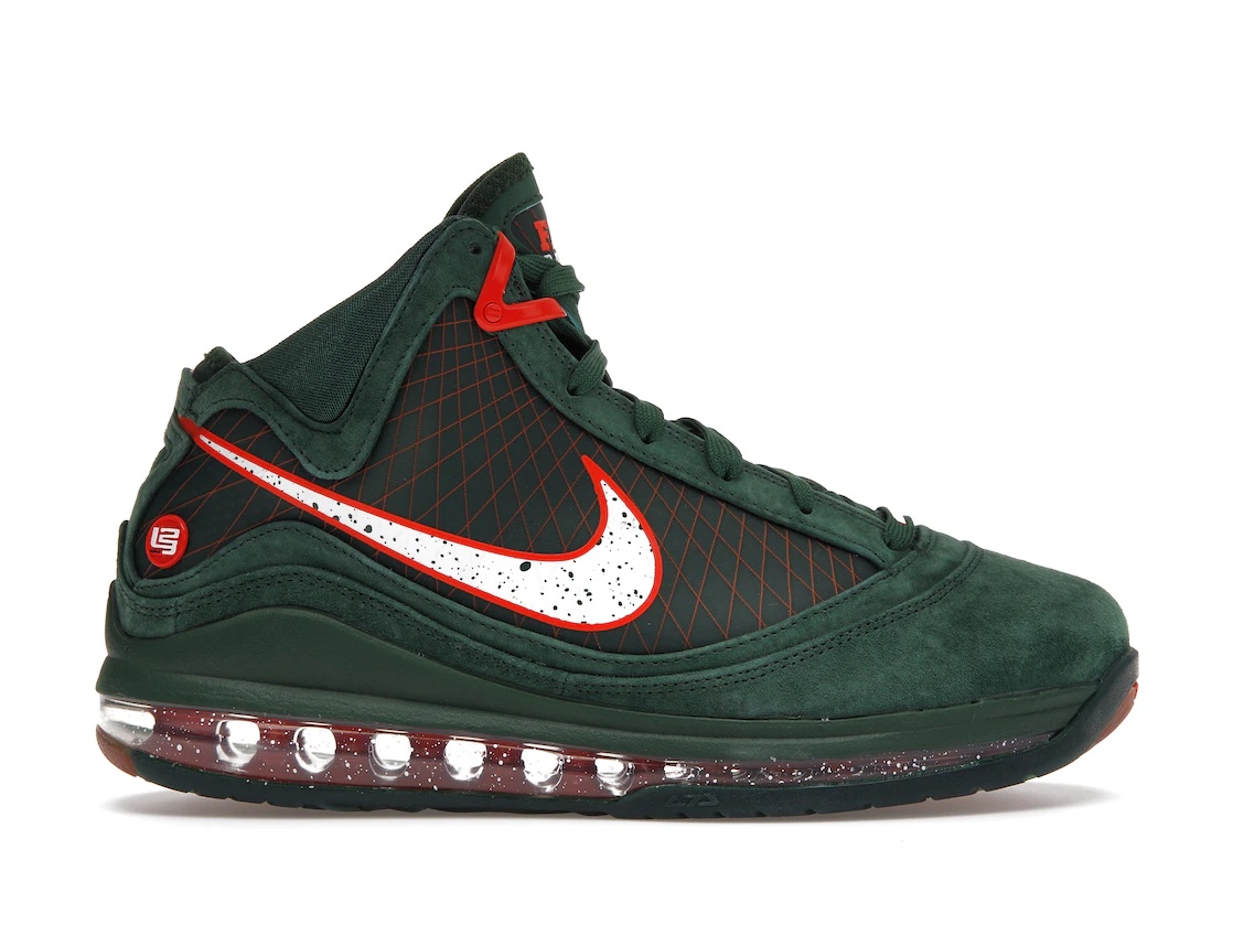 The Nike LeBron 7 FAMU Gorge Green debuts in a striking Gorge Green color scheme, boasting a high-top silhouette constructed from a combination of suede and mesh panels, with notable Team Orange highlights adorning the Swoosh and tongue. The FAMU Gorge Green Nike LeBron 7 side panels showcase a gridded pattern, while the Swoosh logos are embellished with paint splatter details. Notably, from a frontal perspective, there are deliberately mismatched elements, including Twenty and Three on the toe portions and LeBron and James written across the laces. The design also includes metallic embellishments on the collars, mesh tongues featuring Rattler logos, heel imprints of 'L' and 'J,' and visuals of the FAMU rattlesnake mascot on the medial sides. To round off the visual appeal, these sneakers feature full-length Air units with a speckled texture and resilient rubber outsoles optimized for basketball performance. The standout feature of the Nike LeBron 7 FAMU Gorge is its advanced Air technology. This sneaker incorporates full-length Air units, which serve as a pinnacle of cushioning and responsiveness. The sneaker was released on the 7th of December 2022 for $200. - Style DX8554-300 - Colorway Gorge Green/White-Team Orange-Black - Retail Price 200 - Release Date 2022-12-07 - Featured false