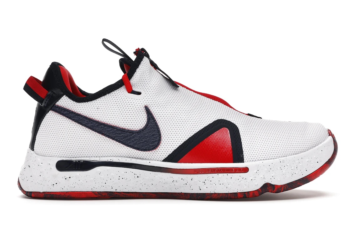 Nike partners with Paul George in this fourth iteration of the Nike PG to produce a textile-centric Nike PG 4 USA constructed from durable polyester and comfy fabric. The rubber outsole in this Nike PG 4 features a university red and coal-black pattern. Its white midsole is adorned by an ash splash and has the Nike Air footbed running the entire shoe length. The vamp of this sneaker is a breathable mesh textile overlay with a red hue on the lateral and a white shade on the medial. The cover has a zip enclosure, which conceals a laced-up silhouette with a webbed design on the eyelets. We like the white, red, and black shades that harmoniously blend to give this shoe the desired aesthetics. The black medial quarter panel has a white swoosh, while the white lateral panel is embellished with a bigger swoosh in sewn-on black leather. The Nike PG 4 USA was released on 3rd July 2020 for $110. - Style CD5079-101 - Colorway White/Obsidian-University Red - Retail Price 110 - Release Date 2020-07-03 - Featured false - Product Line Nike PG