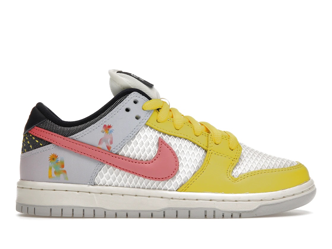 The Nike SB Dunk Low Pro Be True Xavier Schipani, designed by Xavier Schipani, was included in a special edition release. The white mesh upper of this Low Nike Dunk model features Schipani’s graphics on pink-to-lilac leather overlays. The lateral Swoosh is pink, and the medial Swoosh is a lilac gray. One tongue tag sports Nike branding, the other Be True branding. The shoe has a round toe cap, a crossed-lacing system and a white-and-gray rubber outsole with a linear pattern for traction. The Nike SB Dunk Low Pro Be True Xavier Schipani debuted on November 18th, 2022 for $115 retail. - Style DX5933-900 - Colorway Multi-Color/Pink Gaze/Sail - Retail Price 115 - Release Date 2022-11-18 - Featured false