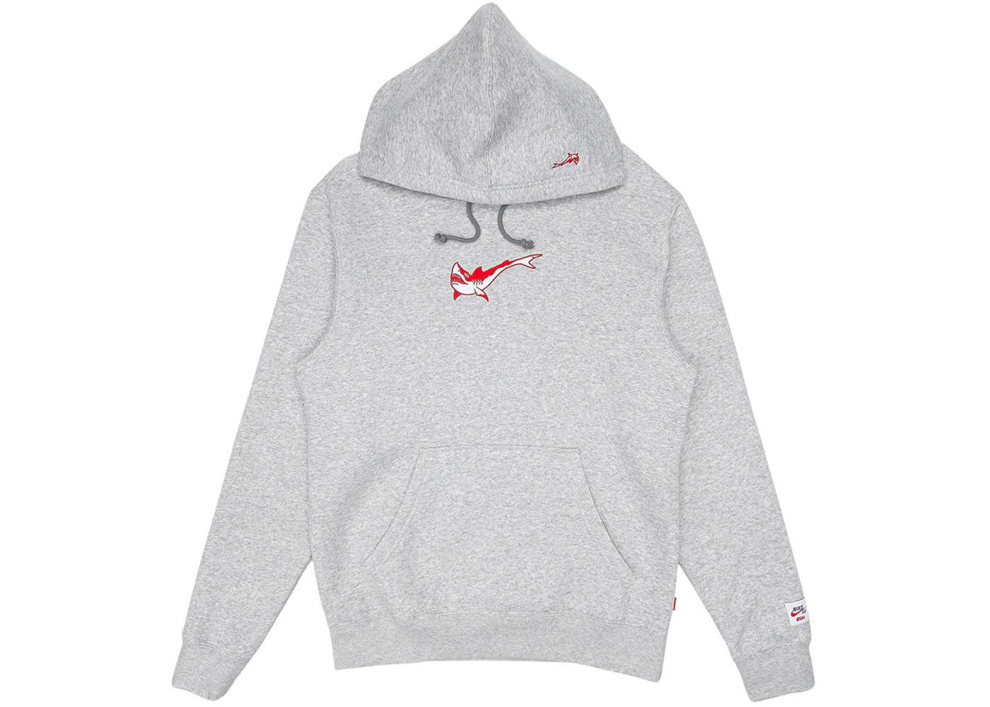 The Nike SB Orange Label x Oski Fleece Skate Hoodie Grey Heather is a grey heather colored hoodie from designed in tandem by the Nike SB Orange Label line and Swedish skateboarder Oskar "Oski" Rozenberg-Hallberg. This is a midweight fleece hoodie made with an 80% cotton and 20% polyester fabric blend from the Nike SB Orange Label collection that is only available in skate shops. This hooded sweatshirt has a jersey-lined hood with drawstrings and ribbed cuffs and waist, all designed to keep you warm. The front pouch is kangaroo style with entry from both sides. There is a small shark embroidered on the hood, and the custom label on the lower left sleeve is co-branded Nike SB and Oski. StockX experts note how this fleece stays true to Oski’s creative vision by featuring his shark-inspired Swoosh that is embroidered in red on the front chest. The red shark is a nod to the light-footed skateboarder and his ferocious approach to the sport. When the Nike SB Orange Label x Oski Fleece Skate Hoodie Grey Heather debuted on January 19th, 2022, it had a retail price of $90. - Season SS22 - Color Grey Heather - Release Date 2022-01-19 - Style DJ3680-050 - Retail Price 90 - Featured false