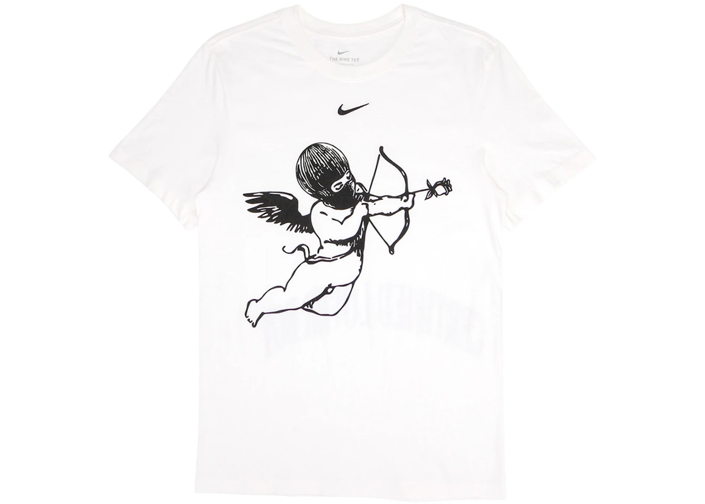 The white version of the Nike x Drake Certified Lover Boy Cherub T-shirt mimics the black version, delivering the inverse in color. This t-shirt features Drake "Certified Lover Boy" branding on the back and Nike branding on the front above a graphic of a masked cherub drawing it's bow and aiming its shot. In full, the collection included twelve items, but four of those items, including the jackets from the capsule, were friends and family exclusives. This white Nike x Drake t-shirt was dropped two days after Drake's birthday on October 26th, 2020, at a retail price of $35 USD. - Season FW20 - Color White - Release Date 2020-10-26 - Retail Price 35 - Featured false