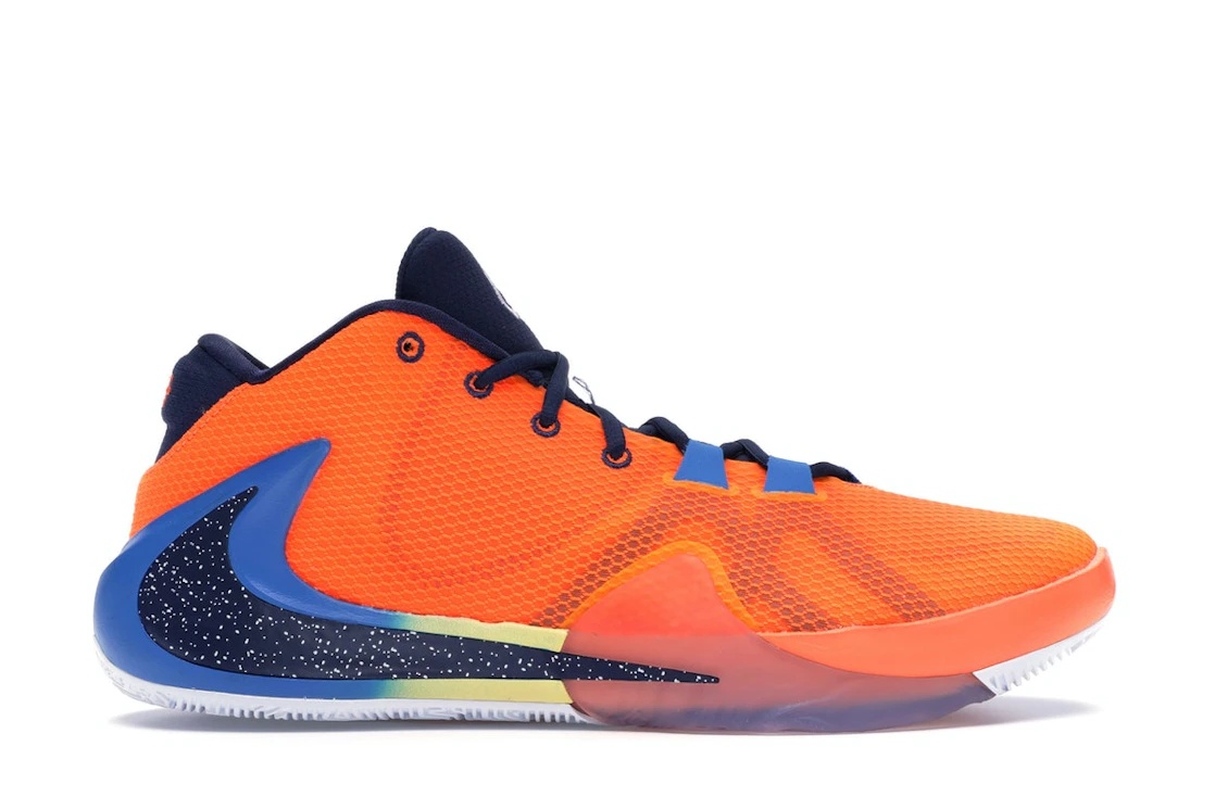 Giannis Antetokounmpo's signature silhouette, the Nike Zoom Freak 1, has a different colorway with the Nike Zoom Freak 1 Antetokounbros. The Nike Zoom Freak 1 Antetokounbros features bright orange mesh taking up the front of the upper’s construction. Black detailing sits right underneath in subtle contrast, though in a way that takes no shine from the reversed Swoosh that sits along the lower half, an accent whose face arrives in galaxy prints and outlines of yellow and blue gradient. Deep midnight navy balances out the lining and laces while leading to the baby blue eye stay, finishing off the pair. The Nike Zoom Freak 1 Antetokounbros was released on June 29th, 2019, at a retail price of $120. - Style BQ5422-800/BQ5423-800 - Colorway Total Orange/Midnight Navy-White-Photo Blue - Retail Price 120 - Release Date 2019-06-29 - Featured false - Product Line Nike Giannis