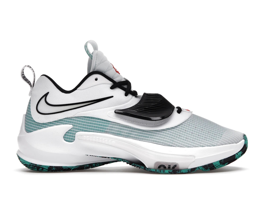 The Nike Zoom Freak 3 Clear Emerald is the third signature collaboration between Nike and Giannis Antetokounmpo in a high-top sneaker silhouette with modern and classic design cues. A colorway of white, clear emerald, total orange, and black is featured on the Nike Zoom Freak 3. The upper is made from white textile with color blocking from a clear emerald green panel on the toe box and extending on the lateral to the heel in a waveform with a teardrop at the ankle. The sneaker has reverse swooshes, outlined in black on the lateral and solid black on the medial. A black TPU hook-and-loop mid-foot strap goes over the black laces and white padded tongue. A red swoosh is embroidered on the tongue’s lower, while the tab features Giannis’ signature. A white Zoom Air unit midsole is fitted onto a camo-designed black and green rubber outsole. What do our experts like about the Nike Zoom Freak 3 Clear Emerald? StockX experts like the bold choice of the reverse swoosh on the sneaker, contrary to most Nike releases. The Zoom Freak 3 was released on October 29, 2021 for $120. - Style DA0695-101/DA0694-101 - Colorway White/Clear Emerald/Total Orange/Black - Retail Price 120 - Release Date 2021-10-29 - Featured false - Product Line Nike Giannis
