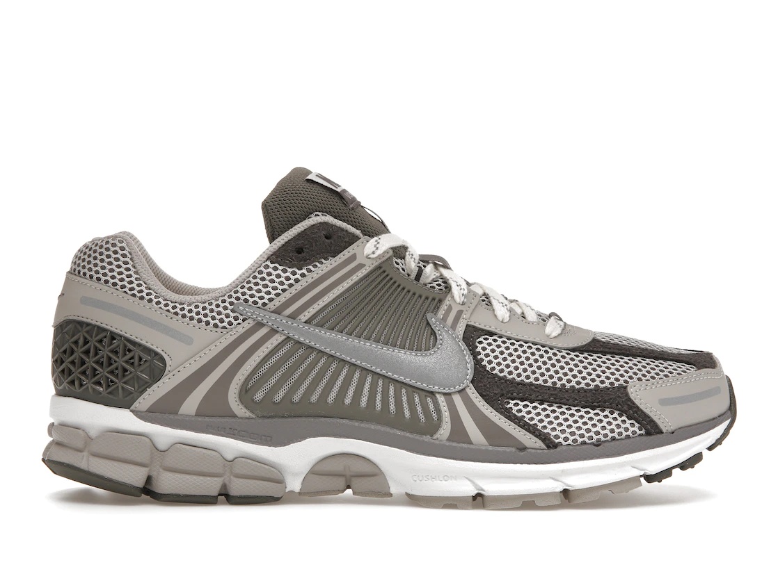 The Nike Zoom Vomero 5 Iron Ore Flat Pewter adorns a low-top silhouette in a light iron ore, metallic silver-photon dust-flat pewter-summit white colorway. The Iron Ore Flat Pewter Nike Zoom Vomero 5 features a mesh upper, which allows for enhanced breathability and comfort. The shoe incorporates Nike's Zoom Air technology, which provides responsive cushioning and shock absorption. In addition, the sneaker includes a padded collar and tongue, offering extra support and comfort around the ankle. The shoe's outsole is made of a durable rubber material with a waffle-pattern design, allowing for traction and grip. Furthermore, the midsole is equipped with foam cushioning that helps provide a plush feel and responsiveness. The sneaker features "NIKE VOMERO 5" branding on the tongue and a Nike Swoosh on the sides and heel. The standout feature of this sneaker is its visually striking combination of iron ore and metallic silver tones. The Iron Ore shade dominates the upper mesh fabric, contrasted by metallic silver elements, adding a touch of shine and creating a captivating look. The Nike Zoom Vomero 5 Iron Ore Flat Pewter was released on January 19, 2023, and sold for an initial price of $160. - Style FD0791-012 - Colorway Light Iron Ore/Metallic Silver-Photon Dust-Flat Pewter-Summit White - Retail Price 160 - Release Date 2023-01-19 - Featured false
