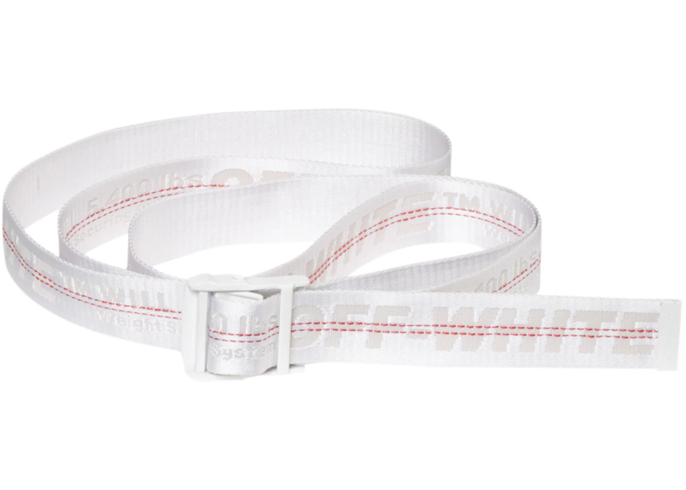 This Off-White Industrial Belt takes the traditional black and yellow design and delivers a white and red take. Similarly to the original industrial belt, the white one features heavy Off-White branding with white clips instead of black. The White Off-White Industrial Belt retailed for a price of $225 USD. - Season SS19 - Color White - Retail Price 225 - Featured false