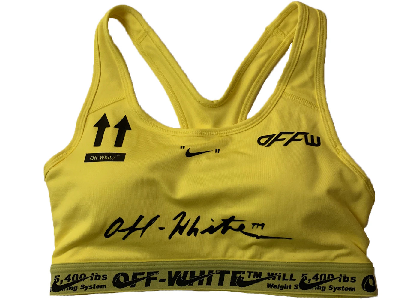 The OFF WHITE Nike Sports Bra Yellow merges high fashion edge with performance functionality. Drenched in Yellow, the design balances athletic support with the distinctive branding language that defined the OFF WHITE and Nike partnership. Clean lines and minimal structure keep the silhouette focused and versatile. This collaboration era blurred the boundaries between gym wear and runway influence. The vibrant yellow tone transforms a training essential into a statement piece, while subtle co branding maintains its cultural weight. It feels bold and expressive, representing a period when sportswear became a central pillar of modern fashion. The OFF WHITE Nike Sports Bra Yellow was released in 2019 with a retail price of $120. - Season FW20 - Color Yellow - Featured false