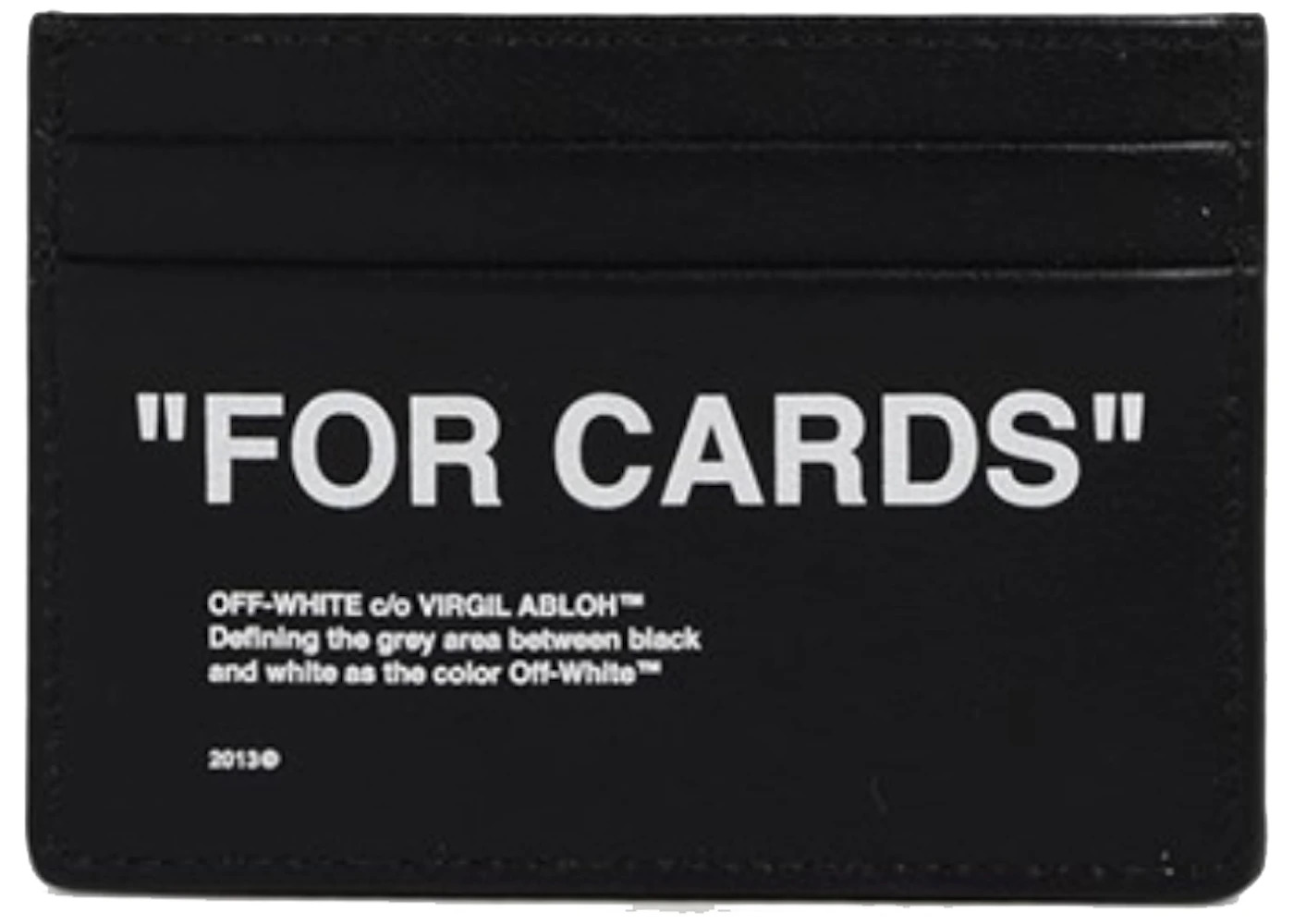 The OFF WHITE Quote FOR CARDS Card Holder 2 Slot Black is constructed from black calfskin leather, measures 2.7 inches high by 3.8 inches wide, and has two slots to hold items such as an ID and credit cards. This OFF WHITE Card Holder features OFF-WHITE’s signature quote for the items use in white lettering on the front along with Virgil Abloh branding and the mission statement for the fashion house. The back of this card holder simply has the FOR CARDS in quotation marks. The OFF WHITE Quote FOR CARDS Card Holder 2 Slot Black sold for a retail price of $260 when it was released in January 2021.Please Note: Dust bag and box are not required for this accessory. - Dimensions 2.7H 3.8W - Material Leather - Color Black - Style OMND017R21LEA001 1001 - Base Model Card Holder (2 Slot) - Base Model Variety Quote "FOR CARDS" - Color Generic Black - Featured false - Height 2.7 - Interior Color Black Leather Interior Lining - Styles Card Case - Width 3.8