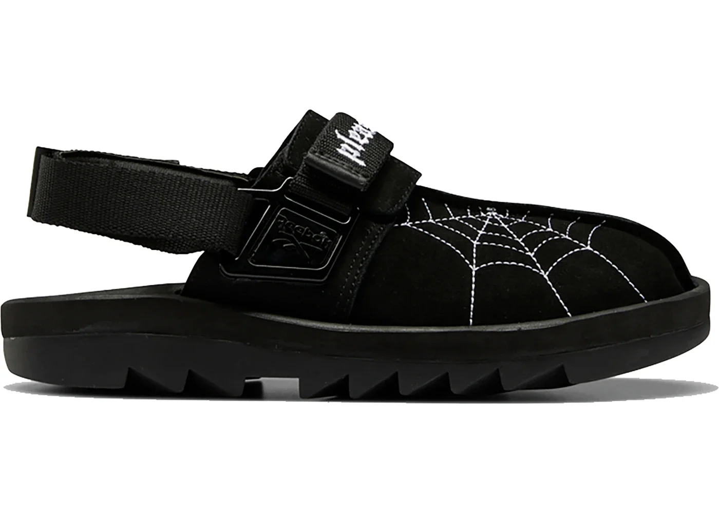 Designed in collaboration with LA-based PLEASURES, the Reebok Beatnik Pleasures offer a unique blend of punk and beat poet aesthetics, drawing inspiration from grunge, metal, and punk music to provide a fresh and distinctive interpretation of the sporty style. The Pleasures Reebok Beatnik sandal boasts a black suede upper with an open heel and dual strap closure ensuring a secure fit. These sandals come with jet-black suede uppers that undergo a gothic transformation, featuring intricate embroidered in contrasting white, tattoo-inspired branding, and a tarantula motif that captures the distinctive grunge aesthetic of PLEASURES. Beneath the unique upper design, the sandals retain their original construction, including the textile straps and rugged rubber outsoles with a jagged, hiking-inspired texture for a distinctive finish. What we love about the Reebok Beatnik Pleasures is its unique and edgy design, featuring a black suede upper adorned with a striking embroidered spider web. The sandal was released on the 31st of July 2020 for $130. - Style FY3418 - Colorway Black/White-Black - Retail Price 130 - Release Date 2020-07-31 - Featured false