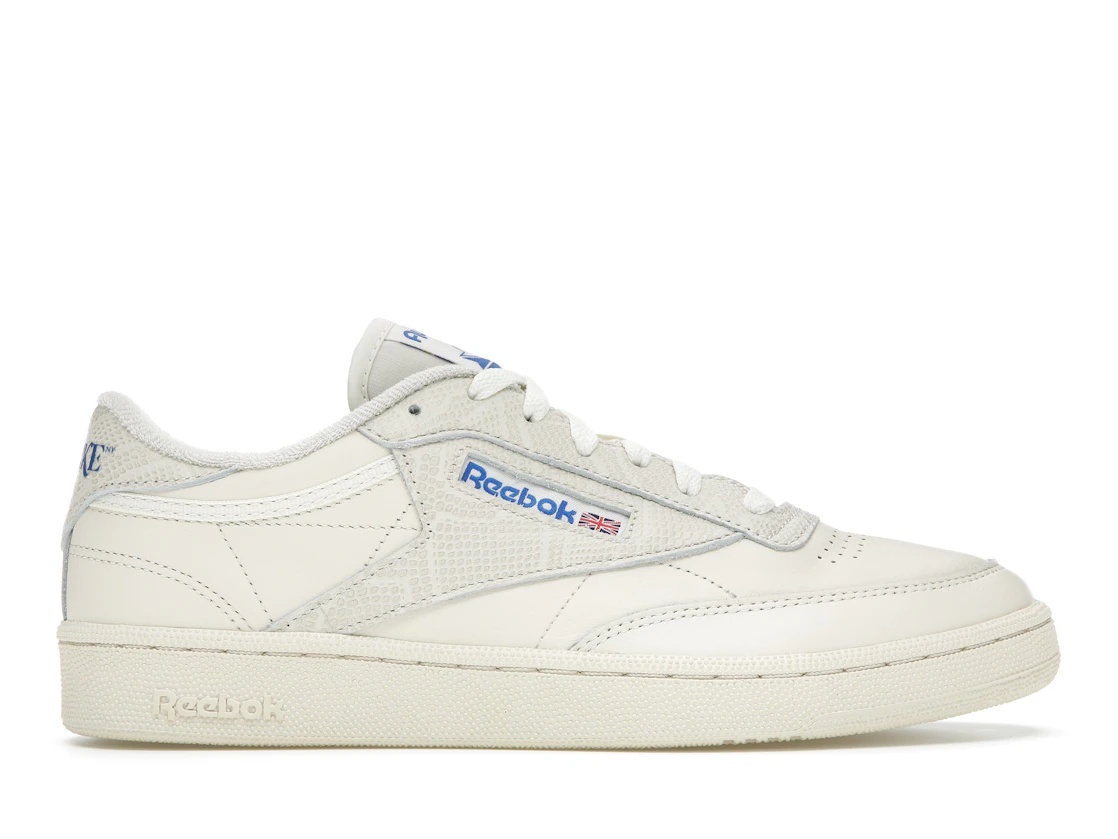 The Reebok Club C Awake NY Snakeskin represents a collaboration between classic sneakers and urban fashion brands. The Awake NY x Reebok Club C Snakeskin features an off-white leather upper with perforations just under the eye stays to facilitate ventilation and increase comfort. An overlay of the same smooth leather enhances the toe cap, and a tonal textile overlay adds a style to the collar. The most eye-catching overlays are made of tonal faux snakeskin and cover the side panel, eye stays, and heel tab. Reebok branding with a Union Jack flag adorns the side panel, while blue Awake branding hits the heel and tongue tag. Blue dual branding appears on the off-white insole. A tonal foam midsole sports embossed Reebok branding, as does the matching grooved rubber outsole. The detail we enjoy most about this sneaker is the off-white fuzzy sock liner, designed to envelop your foot in decadent comfort. The Reebok Club C Awake NY Snakeskin was released on March 13, 2021, for $120 retail. - Style H03328 - Colorway Sandtrap/Chalk - Retail Price 120 - Release Date 2021-03-13 - Featured false