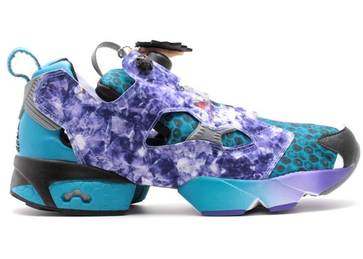 The Social Status x Reebok Pump Fury "Hornets" takes a new design approach to the timeless running turned lifestyle sneaker. Social Status originated in North Carolina and like many people from Charlotte area, the NBA’s Hornets have come to represent the city to them. Considering the popularity of the purple and teal hues within the sneaker world, a Hornets inspired sneaker design is never a bad idea but how do you make your collab stand out? Social Status opted to take the Hornets inspiration to the next level by using photo-realistic prints across the upper of their 20th anniversary Reebok Pump Fury. The purple Pump cage lays over the top of honeycomb graphics but these aren’t the "Hex-a-lite" honeycombs you’re used to seeing on a pair of Reeboks. These honeycomb graphics are printed in a realistic looking way and then colored in that Charlotte Hornets aqua hue that many have come to love. The Hornets Pump Fury also features a teal and purple midsole and teal leather heel that proudly displays the Social Status logo. The Social Status x Reebok Insta Pump Fury OG "Hornets" released in July of 2014 and the timing could not have been better because the NBA’s Charlotte franchise officially changed their name from the Bobcats back to the Hornets in the season that started just a few months later.<b>Please Note: due to natural aging, deadstock pairs may come without a functioning pump unit.<b> - Style V61540 - Colorway Blue/Purple/Black/3M - Retail Price 175 - Release Date 2014-07-05 - Featured false