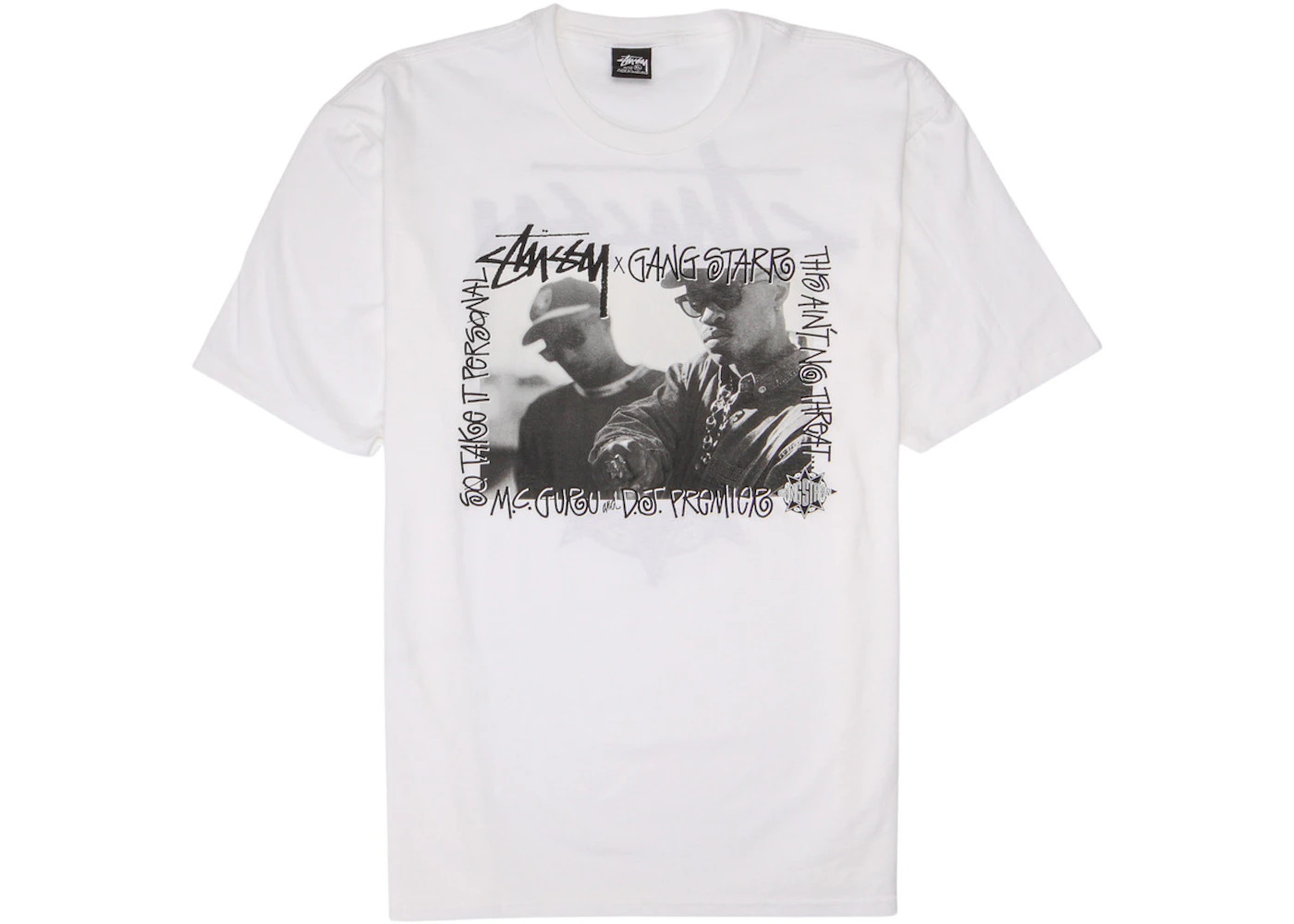 Stussy collaborates yet again with hip hop duo Gang Starr to bring forth a casual t-shirt with street cred in the Stussy Gang Starr Take It Personal Tee White. The design of the Stussy Gang Starr Take It Personal t-shirt incorporates the classic ribbed crewneck and short sleeves with a reinforced border. Its yoke, however, is adorned by a vintage photo in black and white of MC Guru and DJ Prince, the two personalities that make up the Gang Starr duo. Their names, some lyrics from the "Take it Personal" hit, and the signature Stussy brand logo also feature prominently. What StockX experts like about the Stussy Gang Starr Take It Personal Tee White is the Gang Starr screen print on the back. It is encased by a black 6-point star, and atop it is a conspicuous Stussy logo, also in a contrasting black. During its release date on April 7th, 2023, this tee retailed at $45. - Season SS23 - Color White - Release Date 2023-04-07 - Retail Price 45 - Featured false - Uploaded By LL