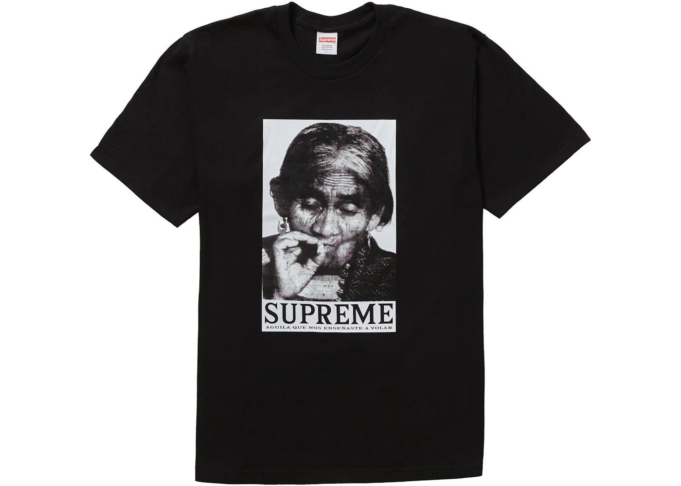 For their FW19 Week 17 release, Supreme released not only their Bandana Box Logo Tees but also an assortment of seven other winter tees. The Supreme Aguila tee released in seven different colorways and features a photo of Maria Sabina, known for introducing the western world to psychedelic mushrooms. Below the photo is the phrase "Aguila Que Nos Ensenaste A Volar" which translates to "Eagle that taught us to fly." The Supreme Aguila Tee released on December 19th, 2019, and retailed for $38 USD. - Season FW19 - Color Black - Release Date 2019-12-19 - Retail Price 38 - Featured false