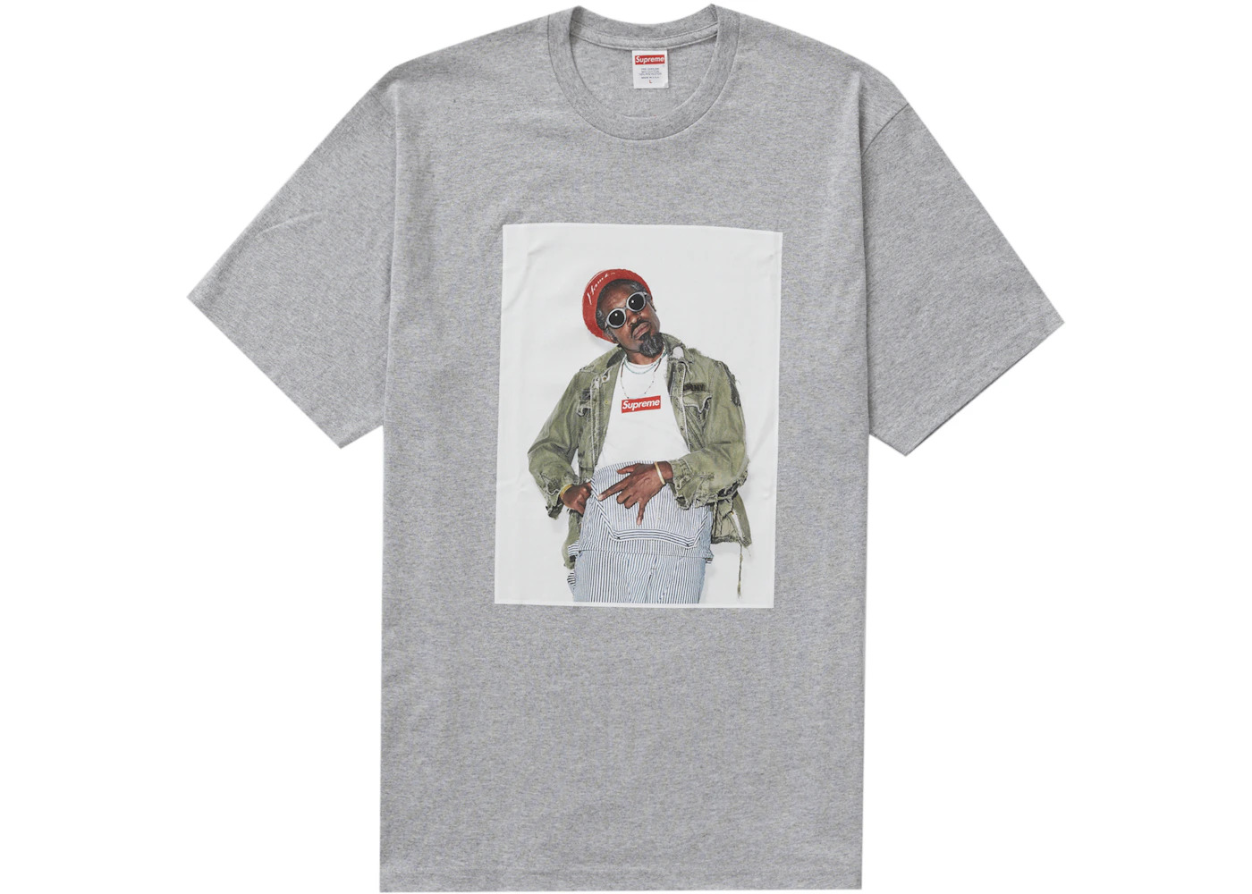 The Supreme Andre 3000 Tee Heather Grey was made with 100% cotton. The t-shirt is hypoallergenic, breathable, water-absorbent, and sustainably produced. This item has a rounded neckline, is Heather Grey in color, and is available in medium, large, extra-large, as well as small sizes. A graphic image of singer Andre Benjamin is printed on the front of this Andre 3000 Tee from Supreme. The garment's back is a solid color. Short sleeves and a boxy silhouette are the additional features of this t-shirt. The Supreme Andre 3000 Tee Heather Grey went on sale for the first time on August 25th, 2022, at $54 as the suggested retail price. - Season FW22 - Color Heather Grey - Release Date 2022-08-25 - Retail Price 54 - Featured false