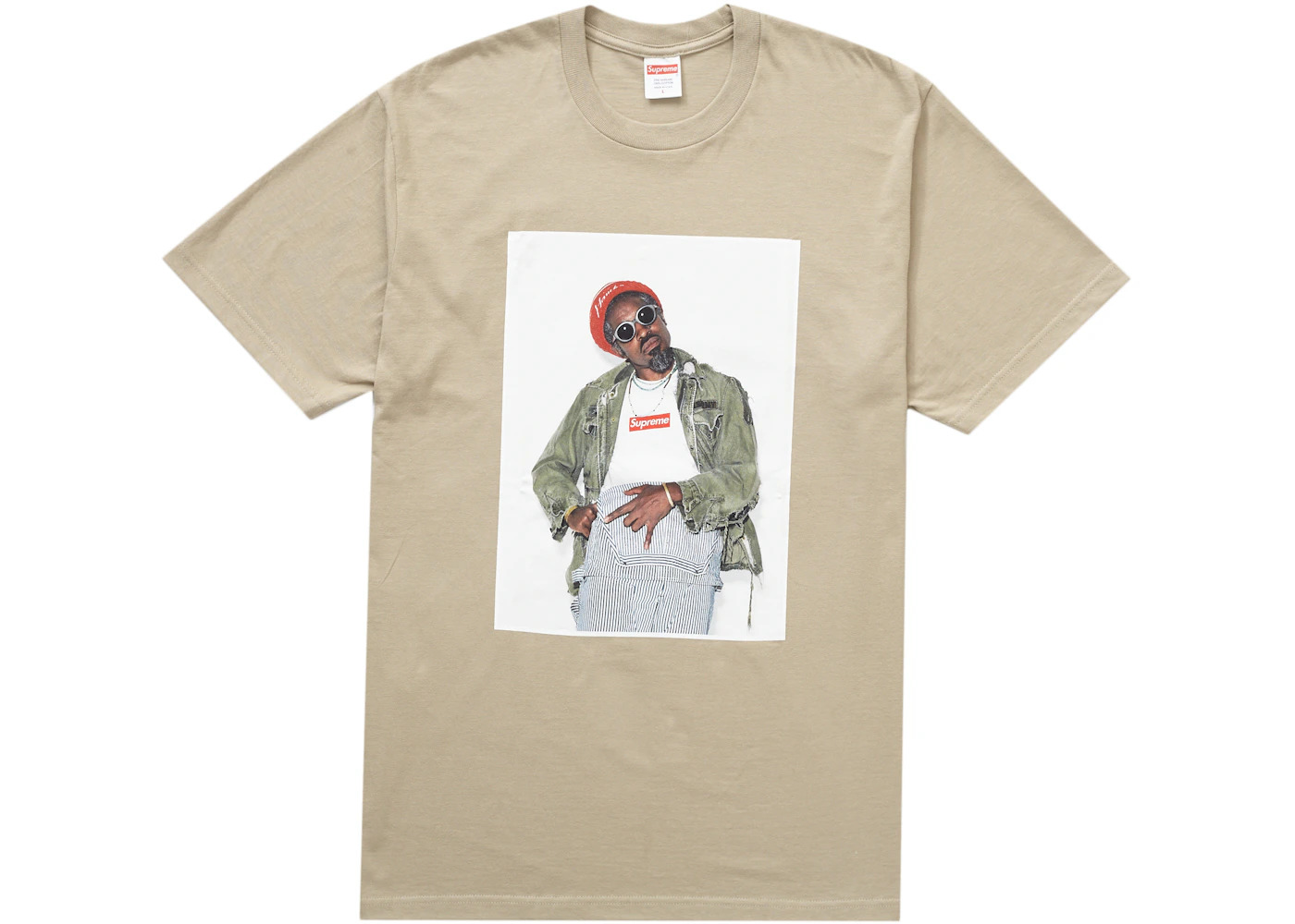 The Supreme Andre 3000 Tee Stone is constructed entirely out of cotton fibers, and is a hypoallergenic, breathable, organically sustainable, and absorbent garment. Additionally, this rounded neckline t-shirt comes in a stone hue color scheme. This stone-colored Andree 3000 tee from Supreme brand has a graphic depiction of musical artist Andre Benjamin displayed on the front side. The back of the tee has a single color. This t-shirt's other features include short sleeves as well as a boxy shape. The Supreme Andre 3000 Tee Stone was first released to the market on August 25th, 2022, at a suggested initial retail price of $54. - Season FW22 - Color Stone - Release Date 2022-08-25 - Retail Price 54 - Featured false