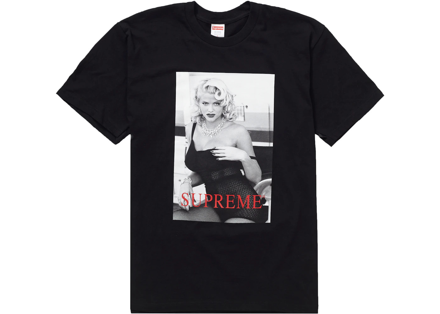 The Supreme Anna Nicole Smith T-shirt was released in seven different colors as a part of the brand's Spring Tees release, which took place in Week 8 of their Spring/Summer 2021 Season. The Spring/Summer 2021 Supreme Spring Tees release included seven new graphic t-shirts that featured imagery like an illustrated dominatrix bear, a t-shirt featuring Miles Davis, and what might have been a loose Michael Jordan reference. The Supreme Anna Nicole Smith T-shirt features an image of the late actress, model, and TV personality above a Supreme logo. This Supreme T-shirt was made available on April 15th, 2021, at the retail price of $48 USD. - Season SS21 - Color Black - Release Date 2021-04-15 - Retail Price 48 - Featured false