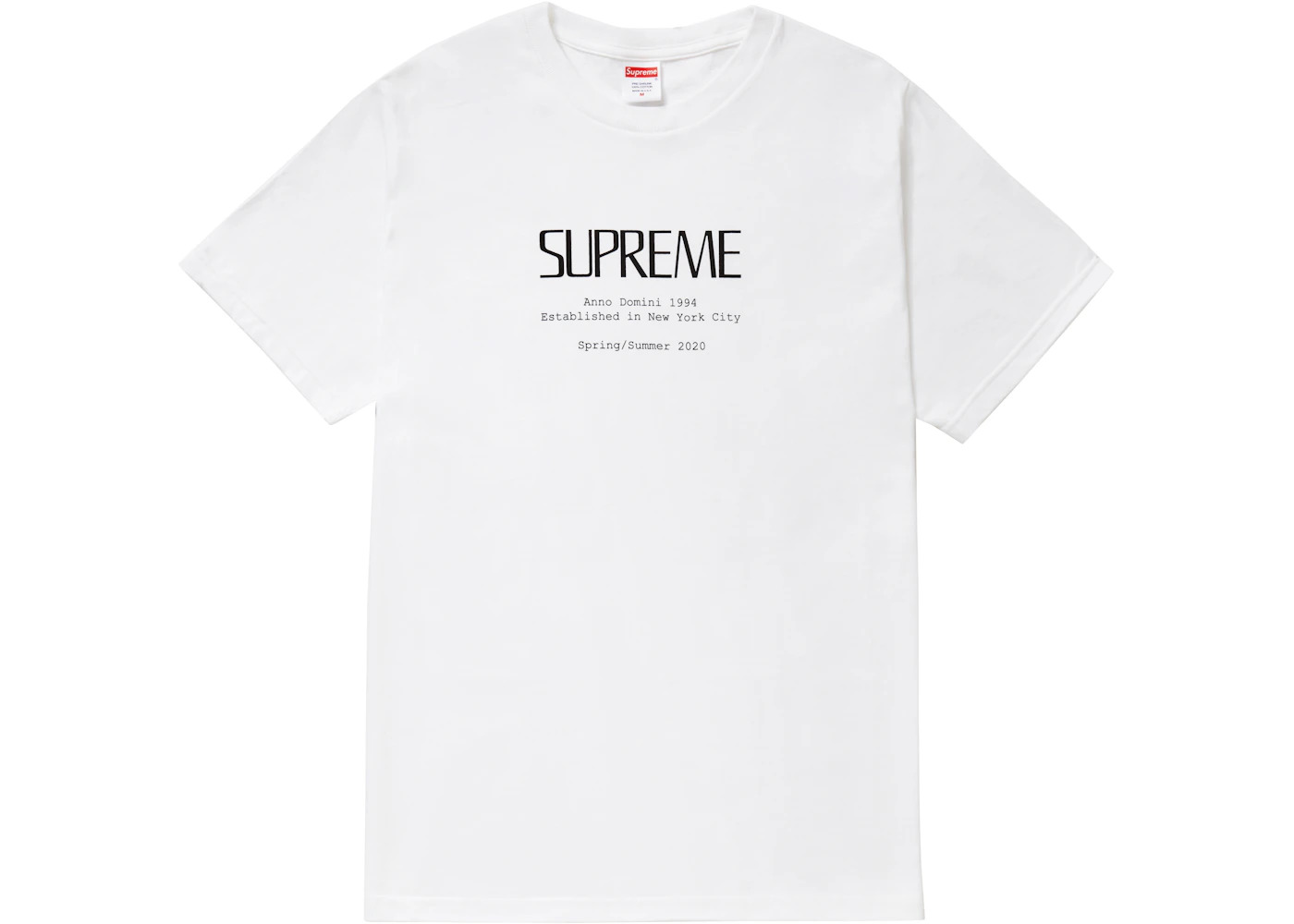 The Supreme Anno Domini Tee White features a bold Supreme logo in the middle of the tee with the medieval latin script "Anno Domini" printed underneath the logo. The words "Established in New York City Spring/Summer 2020" are also printed on the tee in the same font. The Supreme Anno Domini Tee White released in July 2020 and retailed for $38. - Season SS20 - Color White - Release Date 2020-07-02 - Retail Price 38 - Featured false