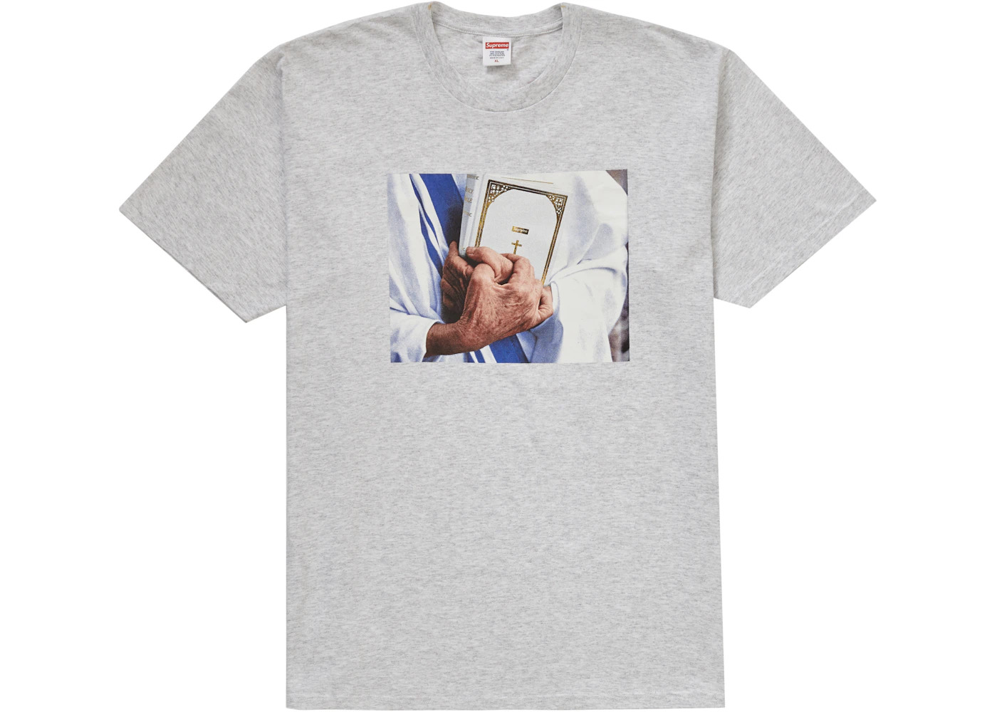 After releasing two major collaborations in a row for weeks 5 and 6, Supreme kept things in-house for their Week 7 release of the FW19 season which featured their second set of fall tees. Released as a part of the tee drop was the Supreme Bible Tee in eight colors. The Bible Tee features an image of what seems to be an elderly priest holding a bible with a Supreme Box Logo on it. The Supreme Bible Tee released on October 10th, 2019, and retailed for $38 USD. - Season FW19 - Color Ash Grey - Release Date 2019-10-10 - Retail Price 38 - Featured false
